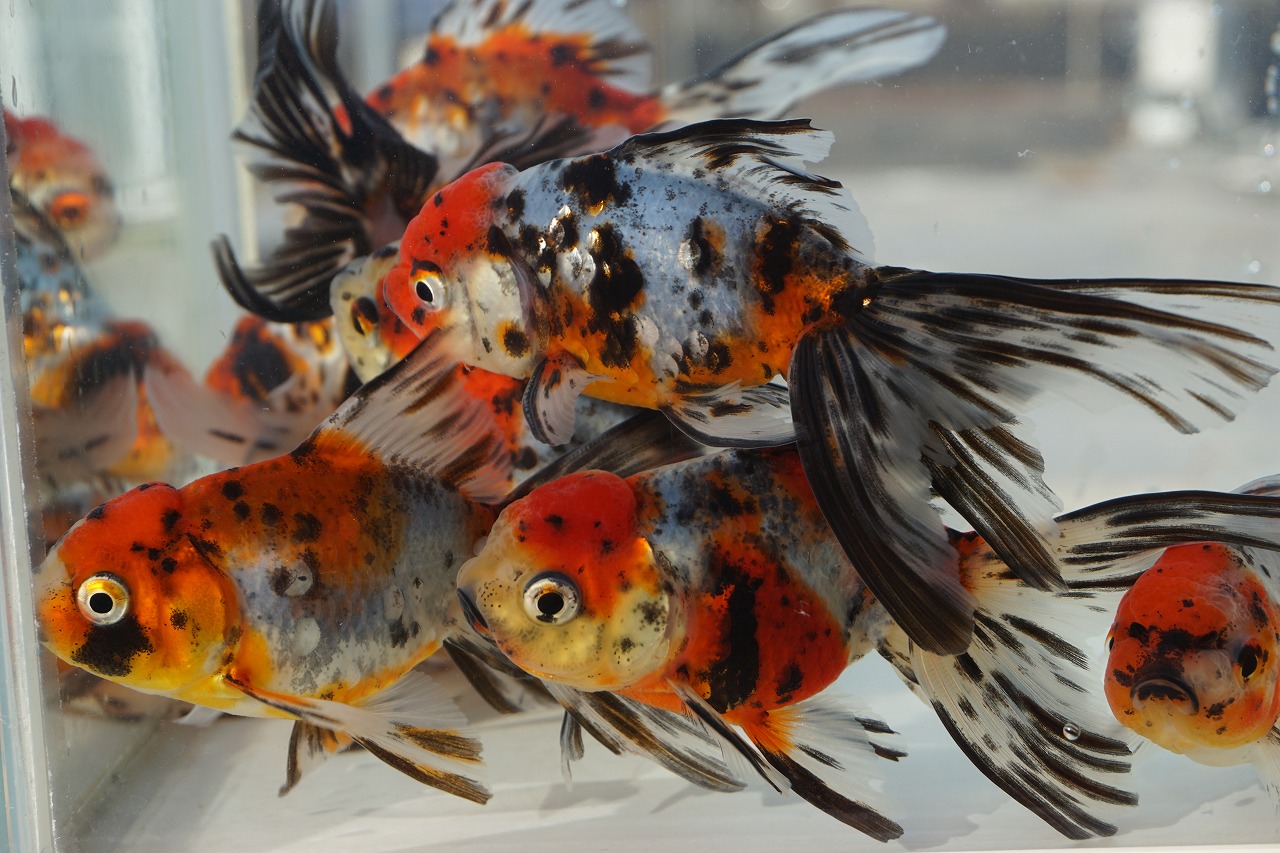 <東錦>オランダシシガシラとキャリコ(三色)出目金との交配種で昭和6年頃に作出されました。浅黄色に墨色と赤色がバランスよく配色され同じ柄は一つとしてなく愛着のわく品種です。頭部の肉瘤の発達と大きく長い尾の優雅さが迫力を引き出します。また丈夫で飼いやすいのも好まれる要因の一つです。 <飯田産金魚 特質>飯田産の金魚は、稚魚から翌年の春まで一般的な土池で育てられ、そのあと選別をし、ハウス内のコンクリート池で2ヶ月以上飼育をしながら良質な煮エサをたくさんを与えます。また、そのハウスでの飼育水が、たいへん丈夫で鮮やかな真っ赤な金魚を作るのに最適なミネラルや鉄分を多く含んでいると思われます。我が社では、三十数年前から親魚等の提供に協力してきました。