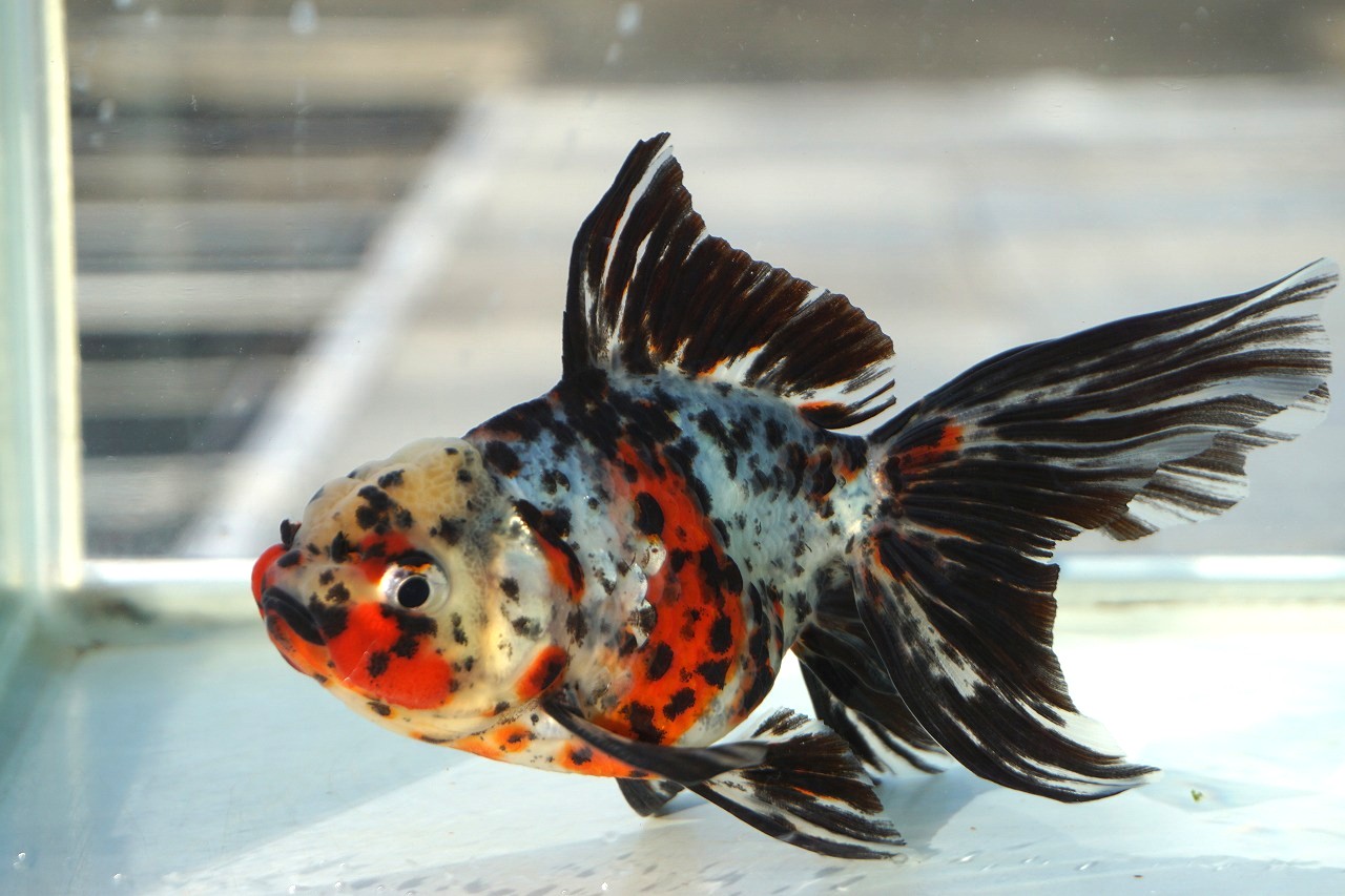 <東錦>オランダシシガシラとキャリコ(三色)出目金との交配種で昭和6年頃に作出されました。浅黄色に墨色と赤色がバランスよく配色され同じ柄は一つとしてなく愛着のわく品種です。頭部の肉瘤の発達と大きく長い尾の優雅さが迫力を引き出します。また丈夫で飼いやすいのも好まれる要因の一つです。 <飯田産金魚 特質>飯田産の金魚は、稚魚から翌年の春まで一般的な土池で育てられ、そのあと選別をし、ハウス内のコンクリート池で2ヶ月以上飼育をしながら良質な煮エサをたくさんを与えます。また、そのハウスでの飼育水が、たいへん丈夫で鮮やかな真っ赤な金魚を作るのに最適なミネラルや鉄分を多く含んでいると思われます。我が社では、三十数年前から親魚等の提供に協力してきました。