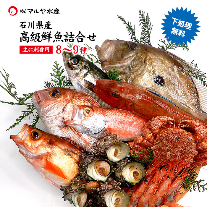 石川県で水揚げされた旬の魚介類からお刺身用を中心に8〜9種類詰め合わせてお届けします。
