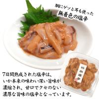 北海道で水揚げされた新鮮なスルメイカを主な原料に使い、イカの旨味を凝縮させるため7日間じっくりと熟成された塩辛です。濃厚な旨味とクセの無い甘口の塩辛ですので、どなたにも喜ばれます。