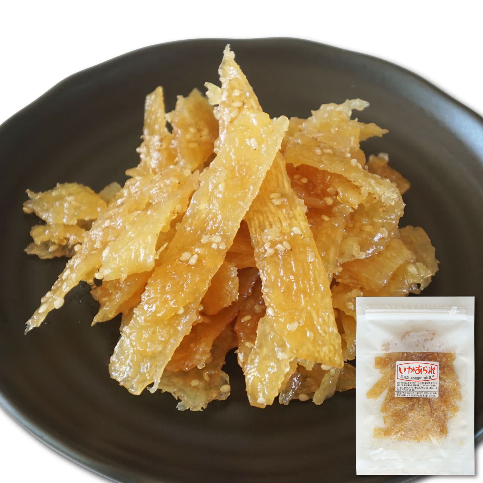 国産イカをローラーでのして柔らかくした“のしいか”を短冊状にカットし、香ばしい白胡麻を散らして風味豊かに仕上げた「いかあられ」。水あめのやさしい甘さと胡麻の香ばしさ、イカ本来の旨みが絶妙に重なり合い、どこか懐かしくも贅沢な味わいに仕上げました。やや歯ごたえのある食感で、噛むほどに旨みが広がり、つい手が止まらない美味しさ。黄金色に輝く透明感のあるイカが食欲をそそります。お子様のおやつから大人のおつまみまで幅広くお楽しみいただけ、お茶請けはもちろん、酒の肴やご飯のお供にもぴったりです。ぜひ一度ご賞味ください。
