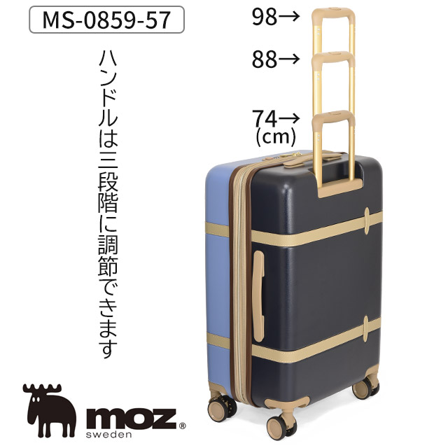 スウェーデンの北欧テイストから生まれた人気のブランドmozのスーツケースです。傷が目立たない、表面エンボスボディ加工。旅先のお土産など、荷物が増えてしまった時に嬉しい、容量UPが可能な拡張機能付きです。静かでスムーズに移動できるサスペンションキャスター搭載。上品なゴールドのキャリーバーが素敵です。3〜5泊程度の国内旅行、修学旅行、合宿など幅広くお使いになれます。かわいいストライプ柄のMOZポーチ付き。