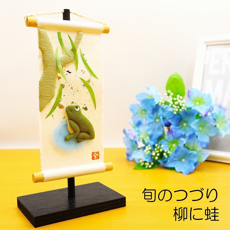 タペストリー 和紙 コンパクト ちりめん 小さい かえる カエル 蛙 / 旬のつづり 柳に蛙 / 玄関 受付 おしゃれ 飾り 置物 紙すき 手作り ミニ 人気