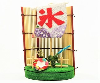 ちりめんで作られた朝顔と招布の″氷″、木製のすだれで夏の情景を表現しています。