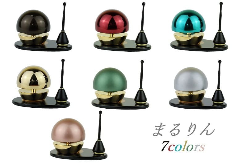丸いフォルムが可愛らしいデザインのおりん。一番の特徴はおりん本体をりん棒でたたいた時の心癒される美しい澄んだ音色です。また、ゆらゆらと揺れながら音を奏でるのも「まるりん」の特徴です。
