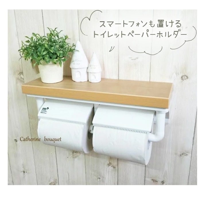 棚付2連紙巻器ならストックがひとつ置けるだけでなく、スマホの一時置き場にも便利です。