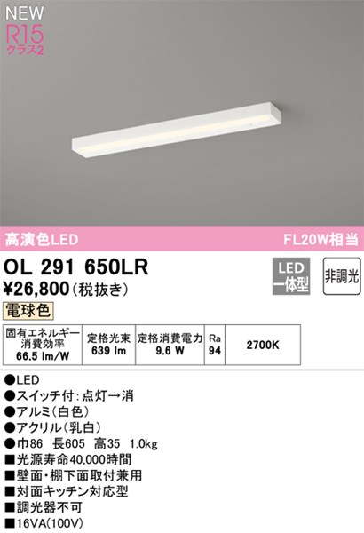 【OL291650LR】オーデリック キッチンライト LED一体型 演色性(Ra):94 電球色 LED照明