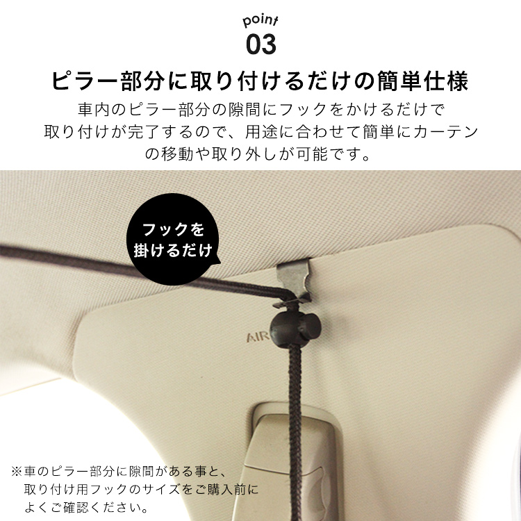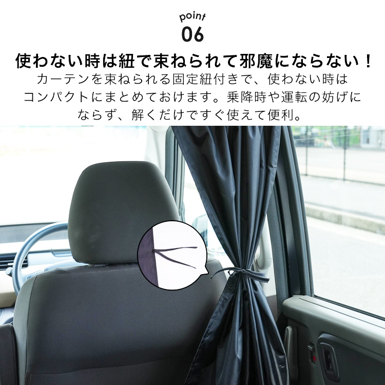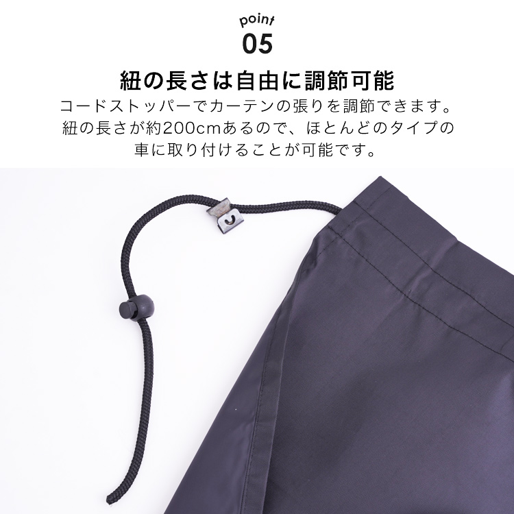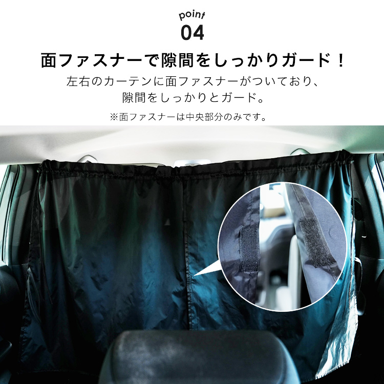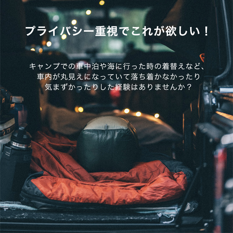 | 商品説明 | プライバシー重視でこれが欲しい! キャンプでの車中泊や海に行った時の着替えなど、 車内が丸見えになっていて落ち着かなかったり 気まずかったりした経験はありませんか? 透けにくく覗き見対策にピッタリの車用カーテンをご紹介します! 車用カーテンは、用途によって使い方いろいろ。 着替えや授乳時の覗き見対策としてはもちろん、 フロントカーテン・リアカーテンとしてもお使いいただけるので、 日除けや盗難防止グッズとしても活躍します。 車内という密閉空間で咳やくしゃみなどの飛沫は、嫌でも心配になってしまうこのご時世。 間仕切りとして利用すれば、飛沫対策や風邪などの感染対策に役立ちます。 ※飛沫を完全に防止できる商品ではありません。 車内のピラー部分の隙間にフックをかけるだけで 取り付けが完了するので、用途に合わせて簡単にカーテン の移動や取り外しが可能です。 左右のカーテンに面ファスナーがついており、隙間をしっかりとガード。 固定用の紐の長さは約200cmあり、自由に調節可能なので ほとんどのタイプの車に取り付けることが可能です。 カーテンを束ねられる固定紐付きで、使わない時はコンパクトにまとめておけます。 乗降時や運転の妨げにならず、解くだけですぐ使えて便利。 |