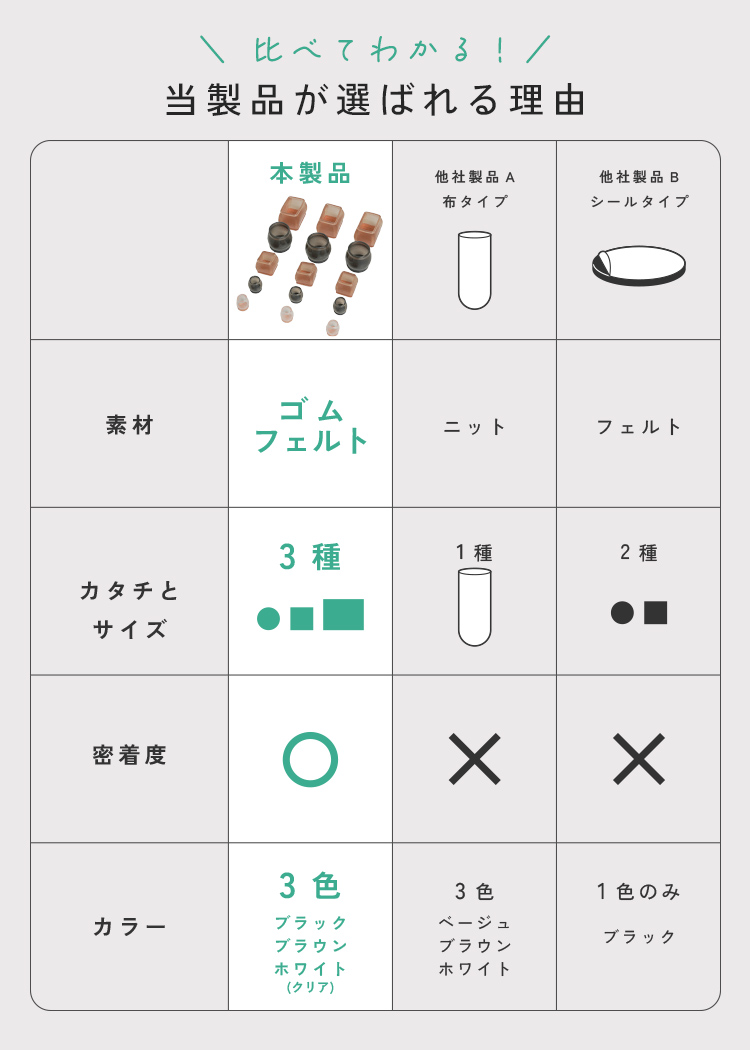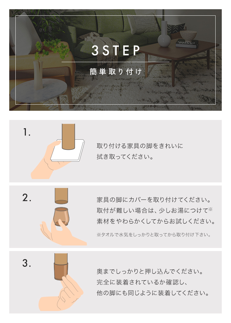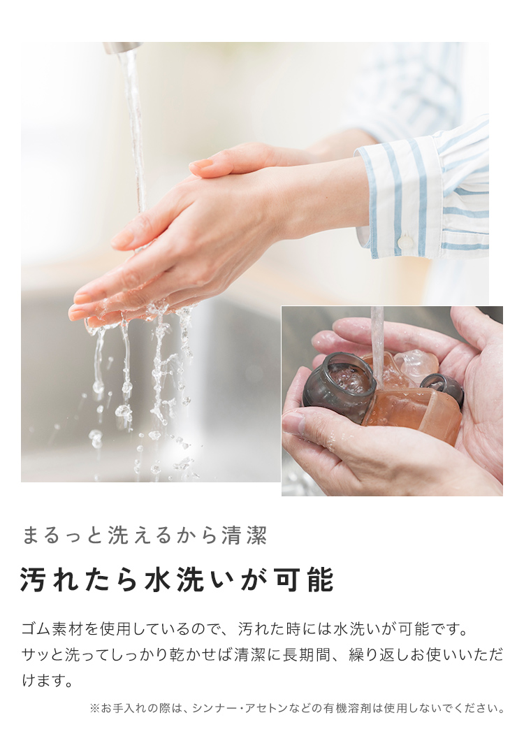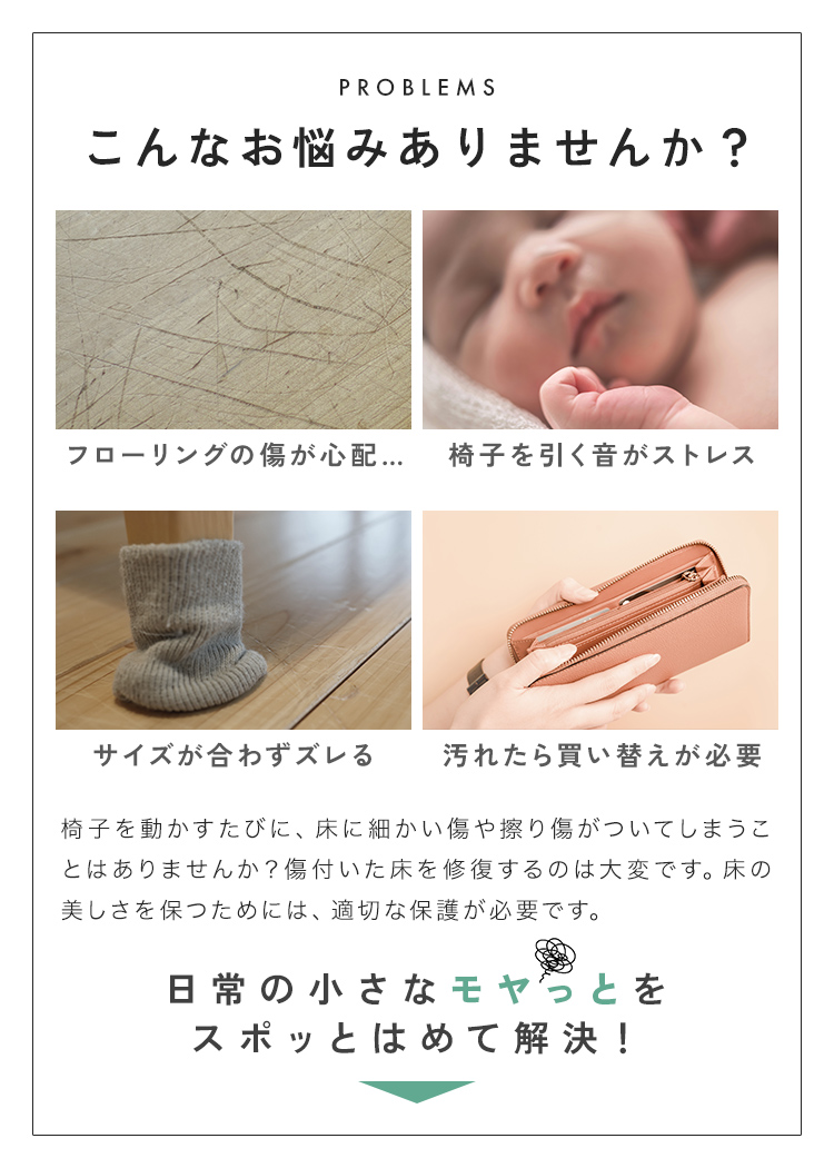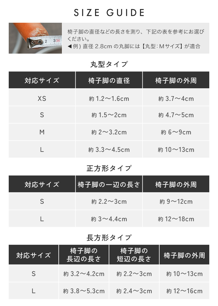 | 【商品説明】 大切な床を傷から守る椅子脚カバー。スポッと取り付けるだけで床と家具の脚をしっかりガード。ゴム素材でできているので、伸縮性抜群で装着も楽々!ぐーんと伸ばして装着した後は、ぴったりフィット。底面は厚さにこだわったクッションのゴム層とフェルト層の2層構造。 ■サイズ 正方形(S):2×2(cm) 正方形(L):3×3(cm) 長方形(S):2×3(cm) 長方形(L):2.4×4(cm) 円形(XS):直径1.2(cm) 円形(S):直径1.4(cm) 円形(M):直径2(cm) 円形(L):直径3(cm) ※推奨サイズは商品画像に記載 ■カラー ホワイト・ ブラック・ブラウン ■素材 TPR素材(エストラマー)・フェルト ■重量 約16g ■セット内容 1セット4コ入り ■注意事項 ・生産時期により色の濃さ等が若干変わる場合がございます。 ・ラバー素材製造上の仕様上、個体によっては形成時のバリが存在する場合がございます。また、梱包内でキャップ同士がくっついている場合はゆっくりと剥がしてご使用下さい。 ・製造上の仕様や輸送時等による型崩れがある場合がございますが、伸ばせして脚に履かせる仕様のため品質には問題ございません。 ・閲覧時のモニター環境により実際の色と若干違う色場合もございます。予めご了承ください。 |