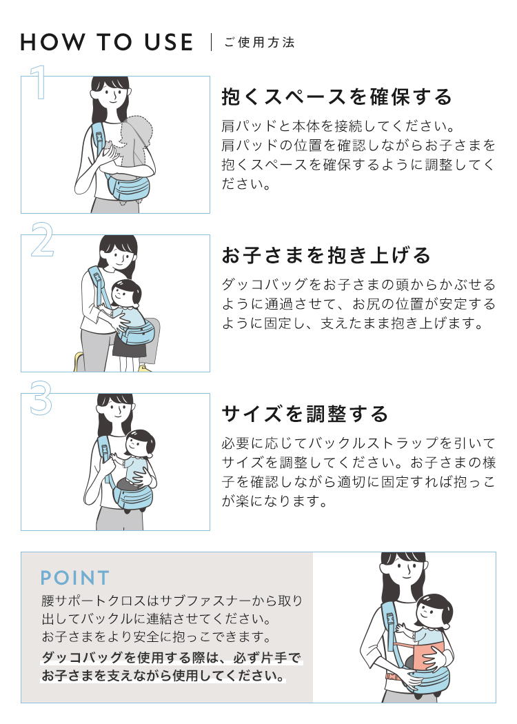 | 注意事項 | ■本製品は、お子さまが一人で座れるようになった時期〜20kgまでご使用いただけます。耐荷重をしっかりと確認し、保護者の身体への負担を考慮してご使用ください。 ■ご使用前に必ず本製品のバックル、ベルト、生地などの状態に問題がないか、しっかりとロックされているかをご確認ください。破損している部分がある場合は、大変危険ですので使用を中止してください。 ■ヒップシートとして使用する際は、安全のため必ずお子さまの身体を片手で支えてください。 ■腰サポートクロスを使用している場合も同様です。お子さまを抱いたりおろしたりする際は、腰を曲げずに膝を曲げて低い姿勢になった状態で行ってください。 ■お子さまを抱っこした際は、姿勢が苦しそうになっていないか、ベルト部分が肌に当たって擦れていないかなどを確認してください。 ■長時間のご使用は肩や腰に負担がかかります。適切な時間でご使用ください。 ■本来の用途以外には使用しないでください。 ■高温・多湿、直射日光の当たる場所での保管はお避けください。カビや変形、変色などの原因となります。 ■製品仕様やパッケージは改良のため予告なく変更される場合があります。 ■素材の特性上、サイズや色味は生産時期やロットにより若干の差異が生じることがあります。 ■商品の色は、画面上の画像と実物とでは多少異なる場合があります。あらかじめご了承ください。 |