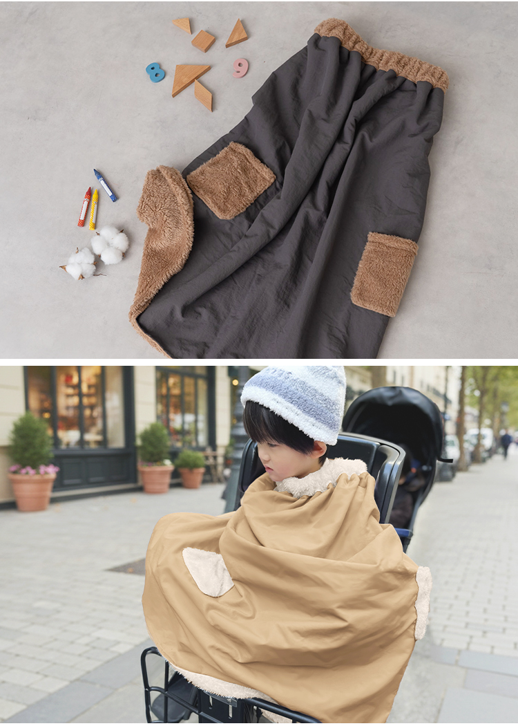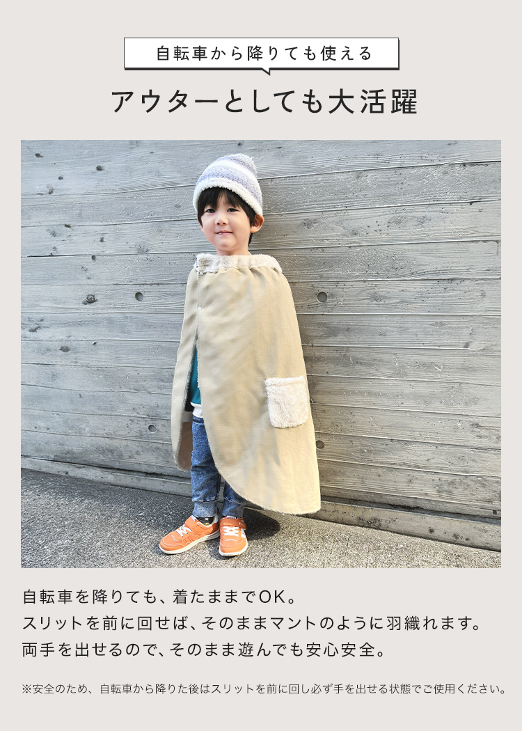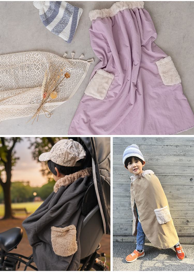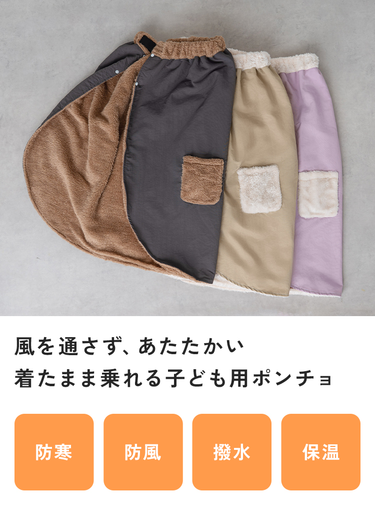 冬の自転車送迎にぴったりの子ども用防寒ポンチョ。表地の風を通しにくいポリエステル生地と、裏地のふんわりとしたファー素材でしっかり保温。