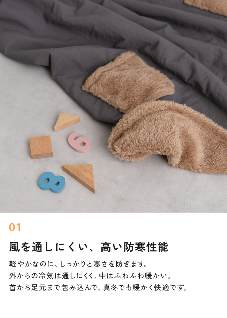 前に回すだけでマントのように羽織れて、そのままアウターとしての使用もOK。ベビーカーにも装着可能。コンパクトに畳めて持ち運びらくらく。