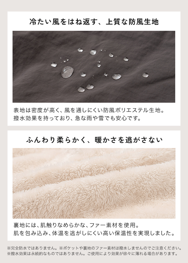 ・ポケットや裏地のファー素材は撥水しませんのでご注意ください。
