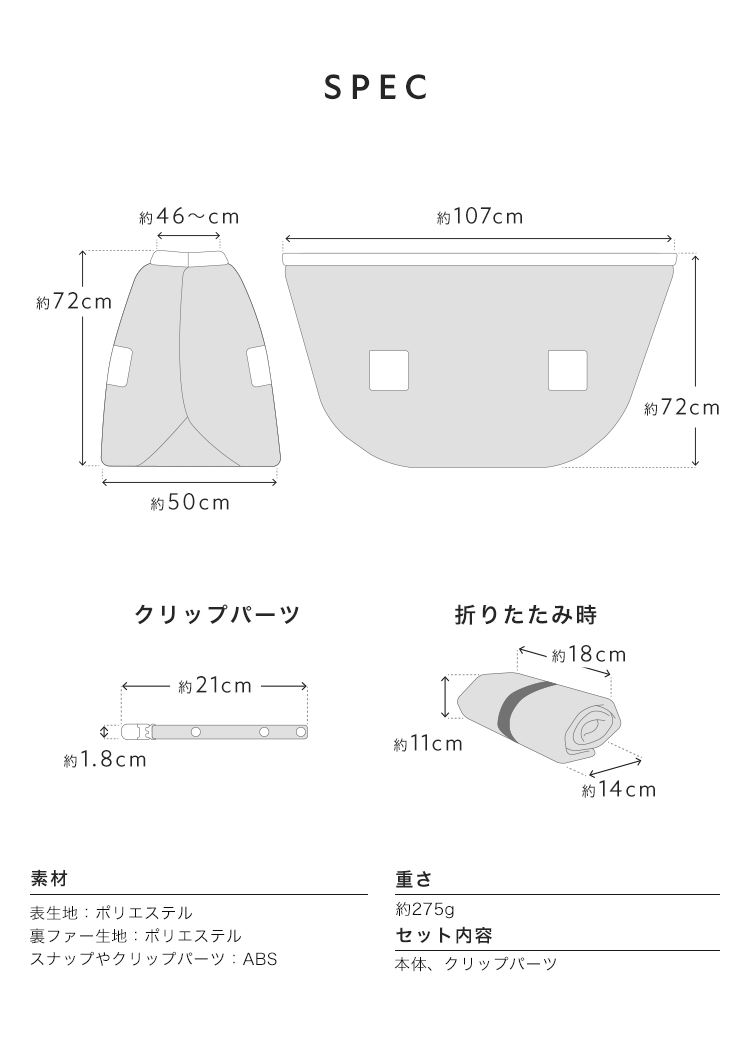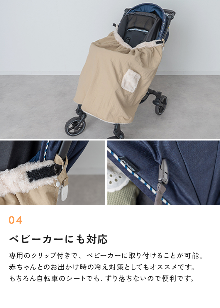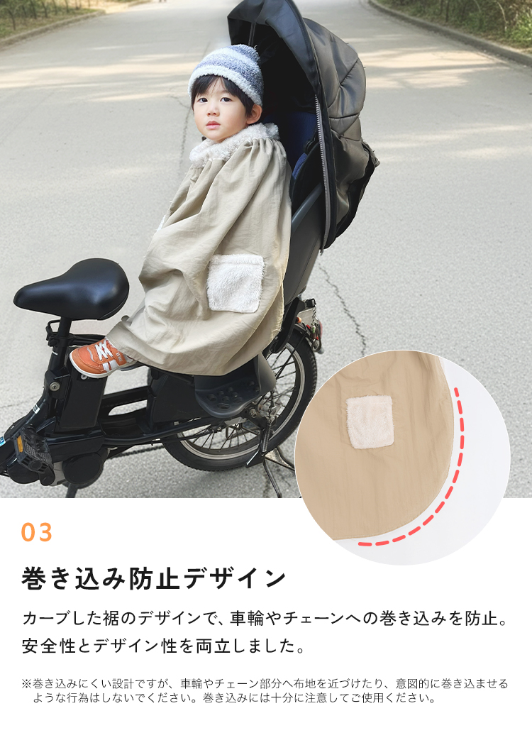 くるッと巻いて留めるだけの簡単装着で、着たままでチャイルドシートへスムーズに座れます。裾が広がりにくい設計で自転車への巻き込みを防ぎます。