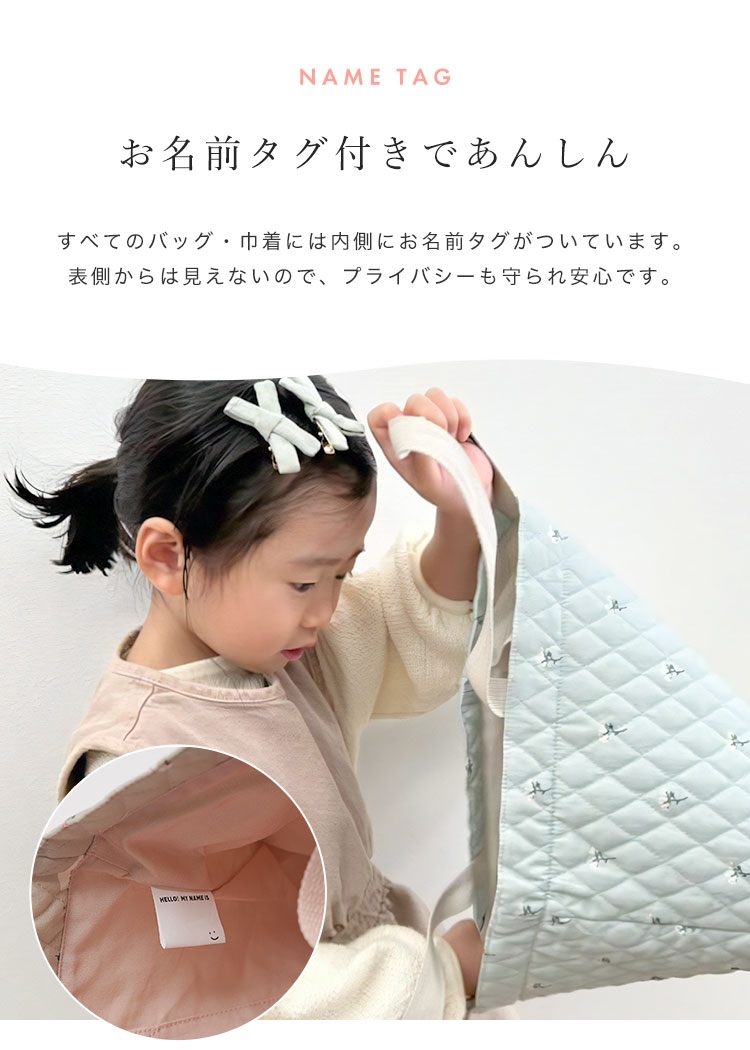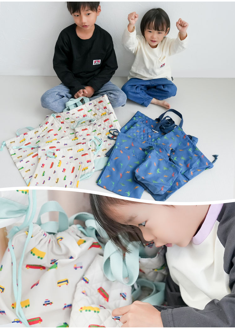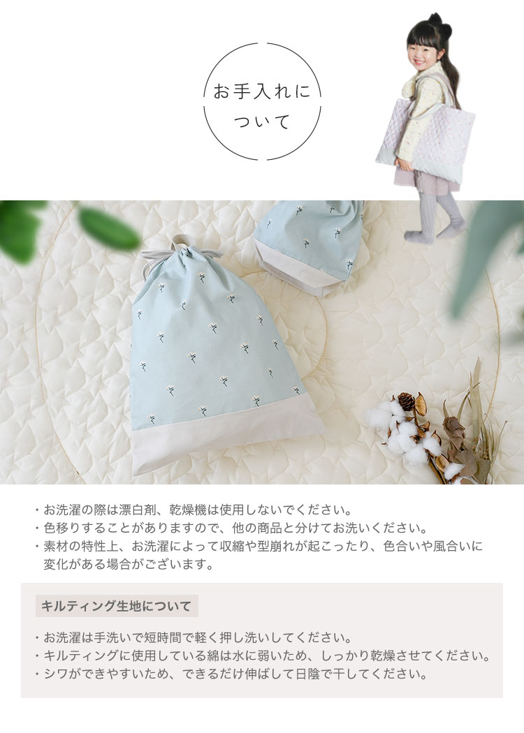 | 重量(約) | ・手提げ:180g ・体操服入れ:66g ・靴入れ:100g ・お弁当巾着:42g ・縦長巾着:30g・ナフキン:60g |