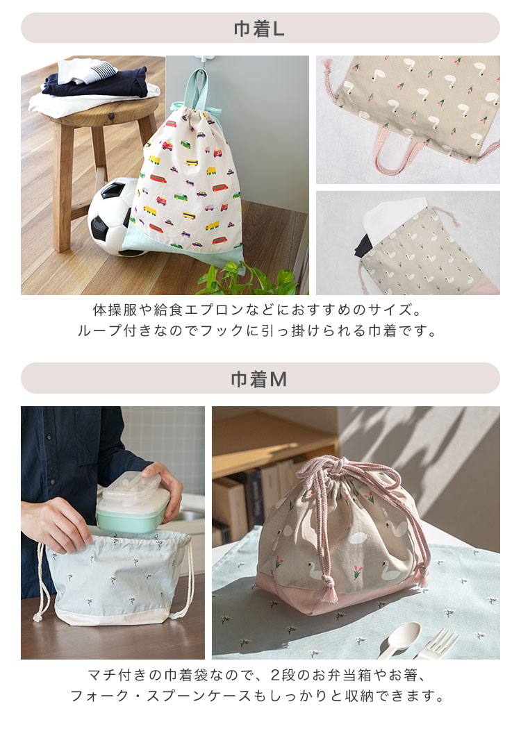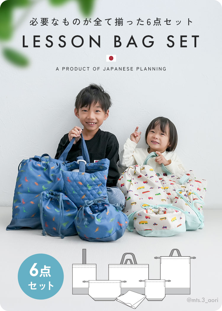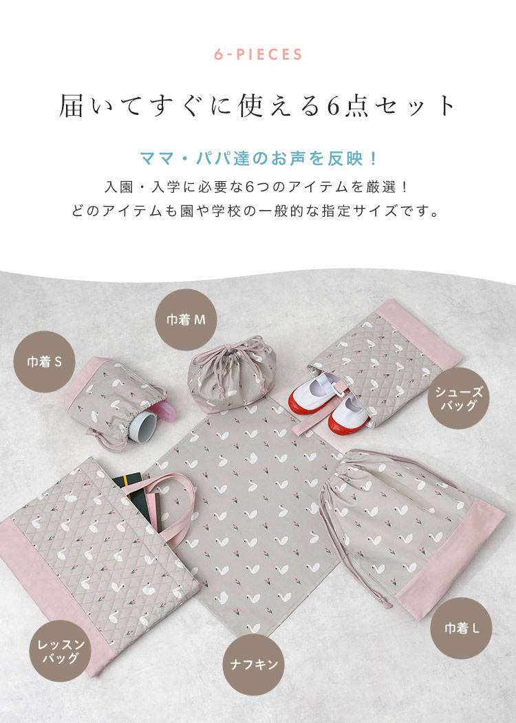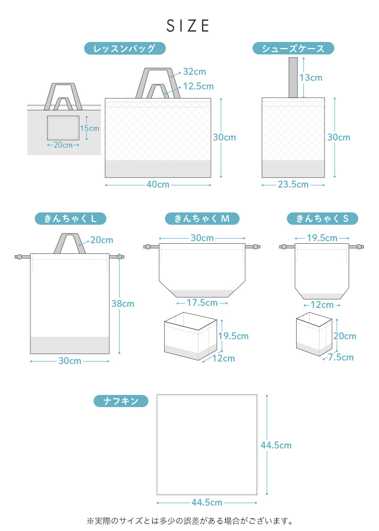 | サイズ(約) | 【レッスンバッグ】 幅:約40cm×高さ:約30cm 持ち手(長さ):約32cm ループ(長さ):約12.5cm 内ポケット:縦約15cm×横約20cm 【シューズケース】 幅:約23.5cm×高さ:約30cm 持ち手(高さ):約15cm 【きんちゃくL】 幅:約30cm×高さ:約38cm ループ(長さ):約20cm マチなし 【きんちゃくM】 幅:約30cm、底幅:約17.5cm、高さ:約19.5cm、マチ:約12cm 【きんちゃくS】 幅:約19.5cm、底幅:約12cm、高さ:約20cm、マチ:約7.5cm 【ナフキン】 幅:約44.5cm、高さ:約44.5cm |
