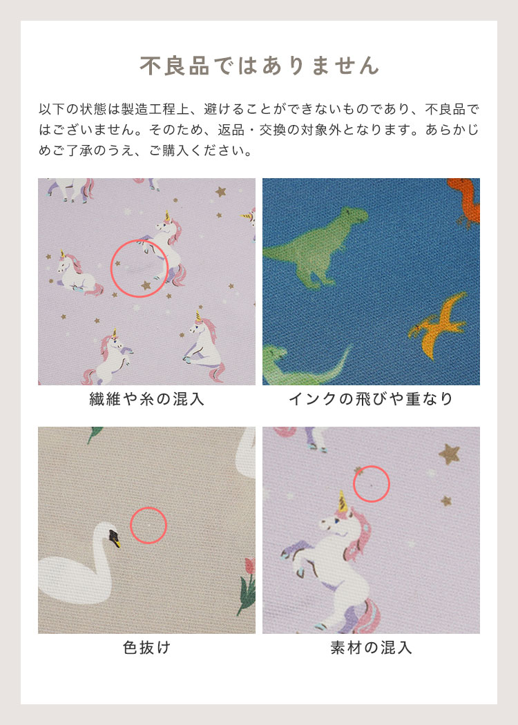 | 注意事項 | 【注意】不良品ではありません。 以下の状態は商品製造上どうしても避けられないものです。 当店では不良生地として認定しないものとし、 ご返品・交換とも受付対象外になります。 あらかじめご了承の上ご購入ください。 ●繊維や糸の混入 ●インクの飛びや重なり ●色抜け 【注意】 ■お手入れ方法 / 使用上の注意 ・漂白剤、乾燥機は使用しないでください。 ・素材の特性上、お洗濯によって収縮や型崩れが起こったり、 色合いや風合いが変わる場合がございます。 ■キルティング生地について ・お洗濯は手洗いで短時間で軽く押洗いをしてください。 また、色移りすることがありますので、他の商品と分けてお洗いください。 ・キルティングに使用している綿は水に弱いため、しっかり乾燥させてください。 ・シワができやすいため、できるだけ伸ばして日陰で干してください。 |