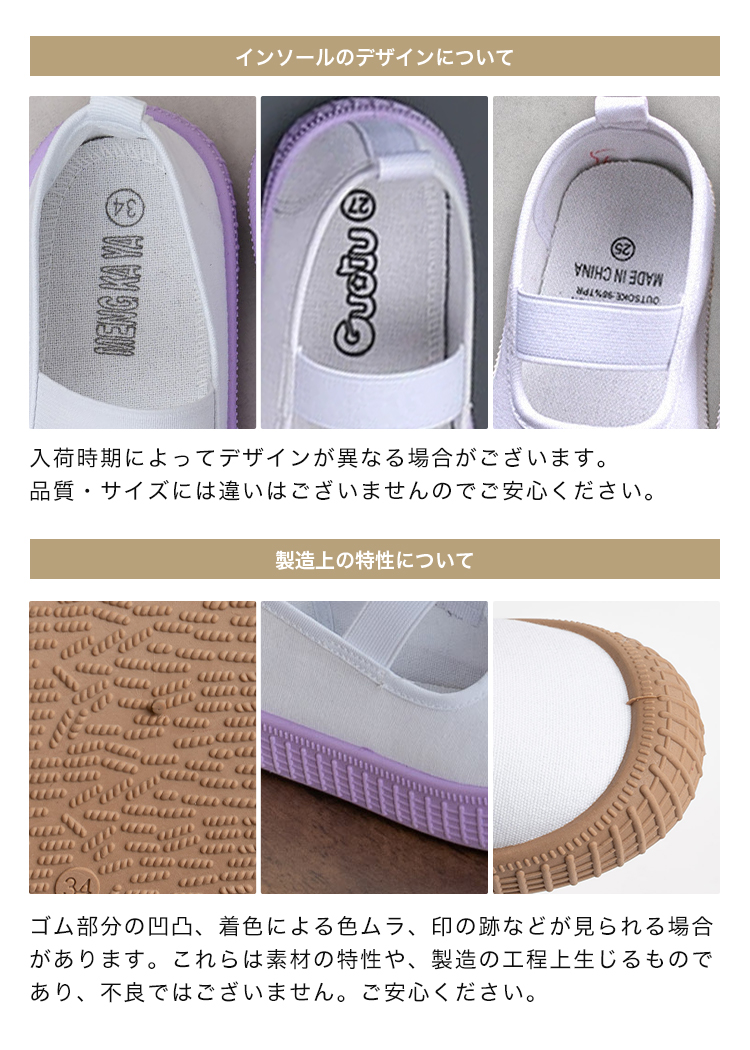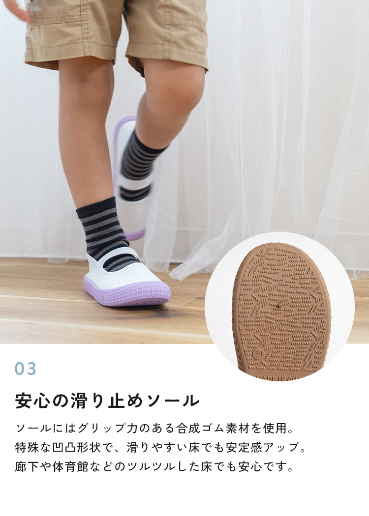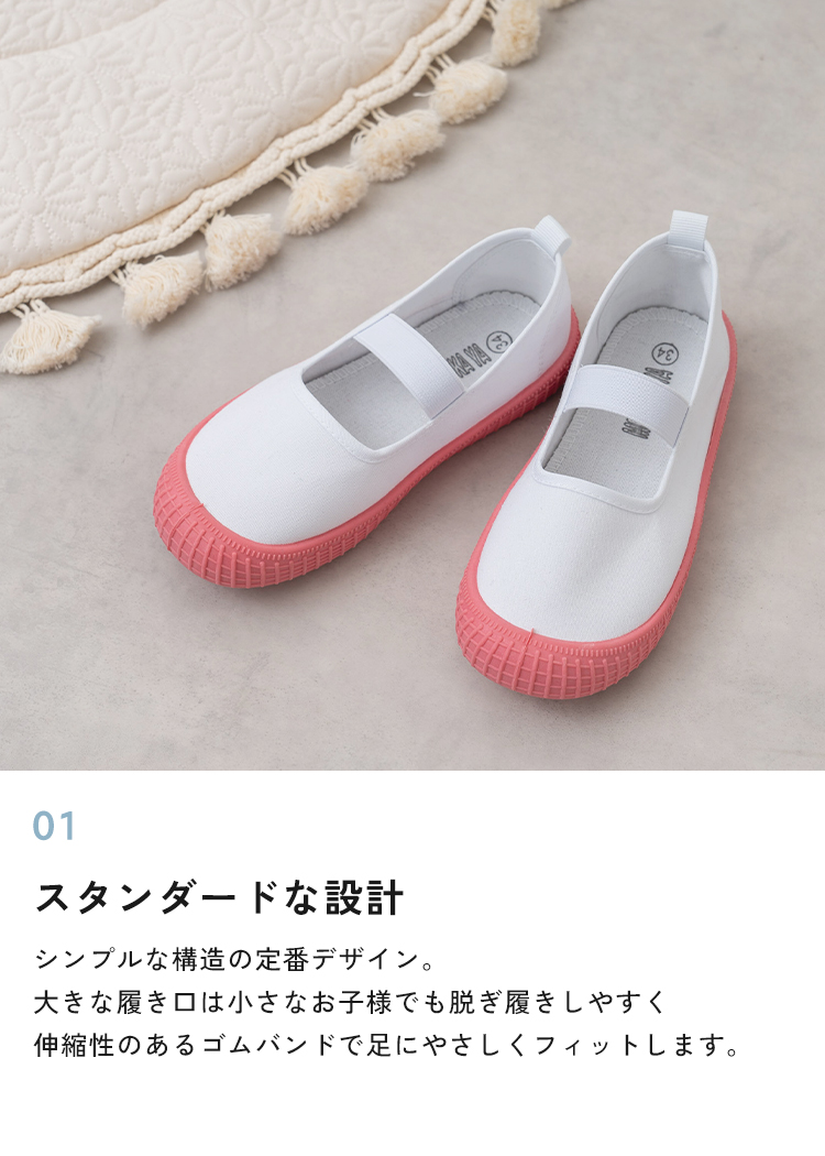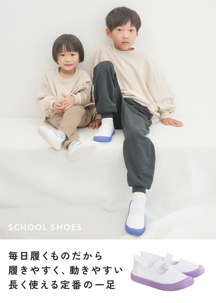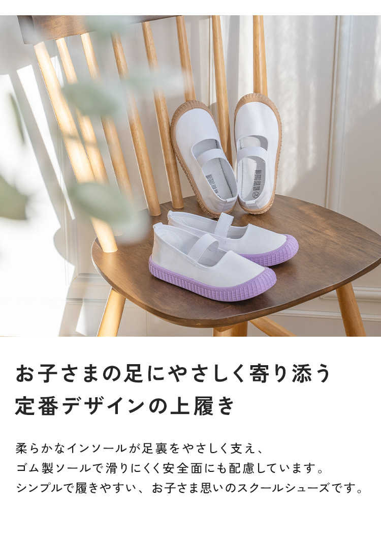 | 【商品説明】 お子さまの足にやさしく寄り添う、定番デザインの上履き。 柔らかなインソールが足裏をやさしく支え、 ゴム製ソールで滑りにくく安全面にも配慮しています。 シンプルで履きやすい、お子さま思いのスクールシューズです。 ■サイズ 18.0cm / 18.5cm / 19.0cm / 19.5cm / 20.0cm / 20.5cm / 21.0cm / 21.5cm ■カラー ホワイト / ブルー / ピンク / パープル / ブラウン ■素材 コットン、合成ゴム ■重量 約 137g (片足 19.0cm) ■注意事項 ・本来の用途以外には使用しないでください。 ・製品仕様やパッケージは改良のため予告なく変更される場合があります。 ・サイズや色味、風合い、質感などは生産時期やロットにより若干の差異が生じることがあります。 ・商品の色は、画面上の画像と実物とでは多少異なる場合があります。あらかじめご了承ください。 ・素材により、色の薄い靴下などと合わせると色移りする場合があります。 ・摩擦により色落ちする場合があります。 ・お子さまの足の成長には個人差があります。サイズ選びにご注意ください。 ・足にかぶれや痒みなど、異常や痛み・違和感を感じた場合は、すぐに使用を中止してください。 ・滑りやすい場所での使用は、転倒の恐れがありますのでご注意ください。 ・本商品は成長期のお子さまに配慮し、足先がしめつけられないようにつま先部分に少し余裕を持たせた設計になっています。ジャストサイズをお選びいただくと、ややゆとりのある履き心地になります。 ・インソールのデザインは入荷時期によって異なる場合がございます。品質・サイズには違いはございませんのでご安心ください。 ・商品の開封直後は素材のにおいが残っている場合がございます。気になる場合は、1〜2日ほど陰干ししていただくと軽減されます。 ・火気の近くや高温の場所で使用・保管しないでください。 ・高温・多湿、直射日光の当たる場所での保管はお避けください。カビや変形、変色などの原因となります。 [商品の包装について] メール便にて、かかとを折りたたんだ状態での配送となります。 |
