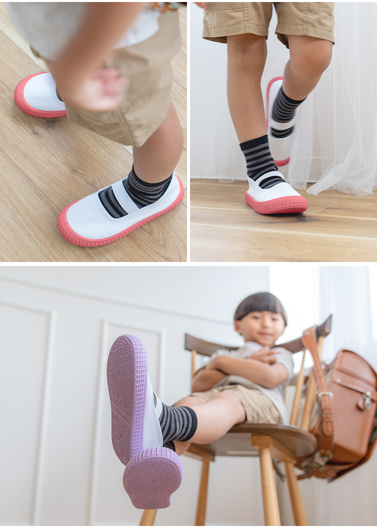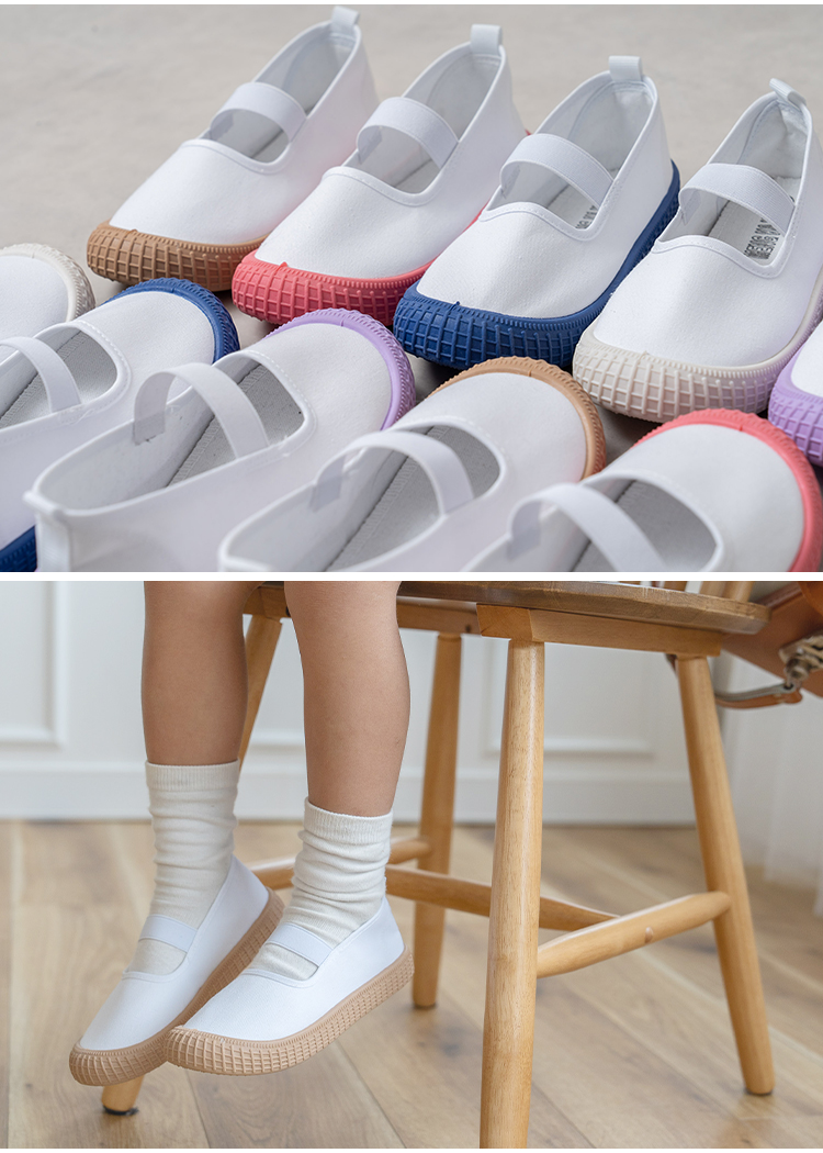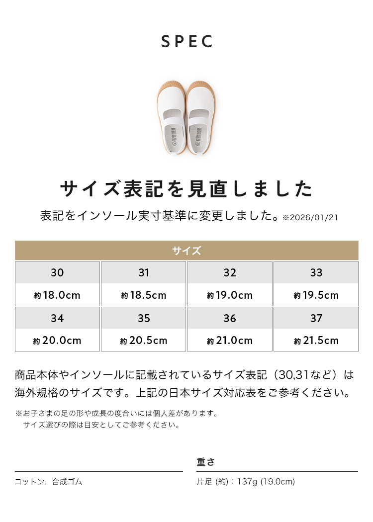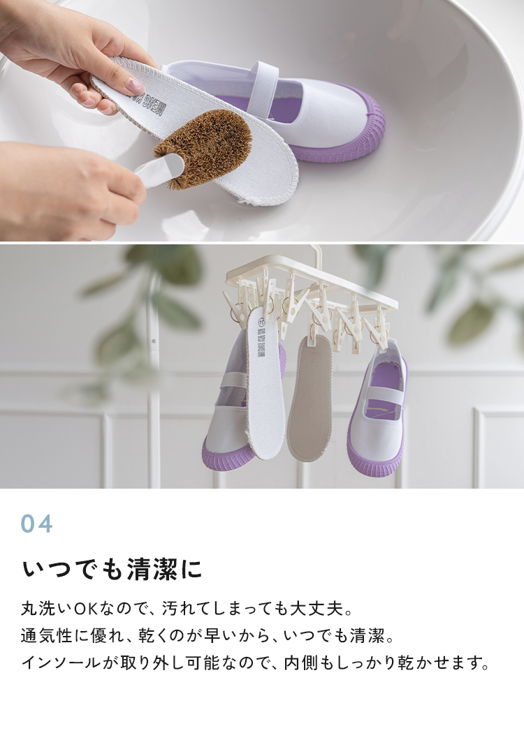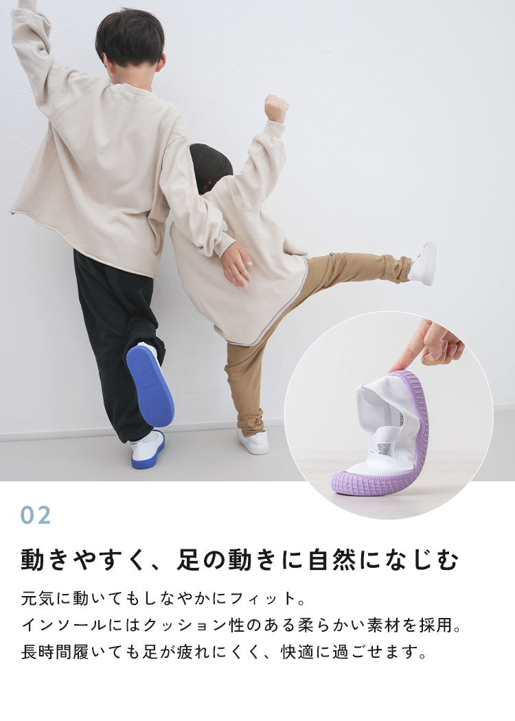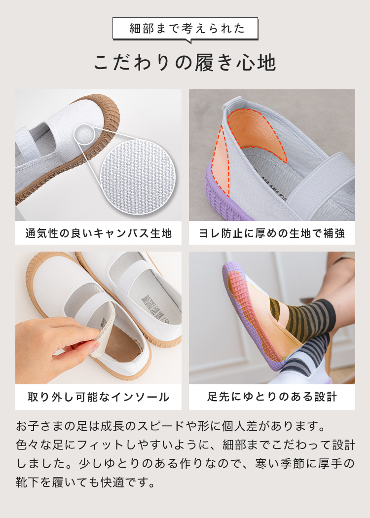 | 【商品説明】 お子さまの足にやさしく寄り添う、定番デザインの上履き。 柔らかなインソールが足裏をやさしく支え、 ゴム製ソールで滑りにくく安全面にも配慮しています。 シンプルで履きやすい、お子さま思いのスクールシューズです。 ■サイズ 18.0cm / 18.5cm / 19.0cm / 19.5cm / 20.0cm / 20.5cm / 21.0cm / 21.5cm ■カラー ホワイト / ブルー / ピンク / パープル / ブラウン ■素材 コットン、合成ゴム ■重量 約 137g (片足 19.0cm) ■注意事項 ・本来の用途以外には使用しないでください。 ・製品仕様やパッケージは改良のため予告なく変更される場合があります。 ・サイズや色味、風合い、質感などは生産時期やロットにより若干の差異が生じることがあります。 ・商品の色は、画面上の画像と実物とでは多少異なる場合があります。あらかじめご了承ください。 ・素材により、色の薄い靴下などと合わせると色移りする場合があります。 ・摩擦により色落ちする場合があります。 ・お子さまの足の成長には個人差があります。サイズ選びにご注意ください。 ・足にかぶれや痒みなど、異常や痛み・違和感を感じた場合は、すぐに使用を中止してください。 ・滑りやすい場所での使用は、転倒の恐れがありますのでご注意ください。 ・本商品は成長期のお子さまに配慮し、足先がしめつけられないようにつま先部分に少し余裕を持たせた設計になっています。ジャストサイズをお選びいただくと、ややゆとりのある履き心地になります。 ・インソールのデザインは入荷時期によって異なる場合がございます。品質・サイズには違いはございませんのでご安心ください。 ・商品の開封直後は素材のにおいが残っている場合がございます。気になる場合は、1〜2日ほど陰干ししていただくと軽減されます。 ・火気の近くや高温の場所で使用・保管しないでください。 ・高温・多湿、直射日光の当たる場所での保管はお避けください。カビや変形、変色などの原因となります。 [商品の包装について] メール便にて、かかとを折りたたんだ状態での配送となります。 |
