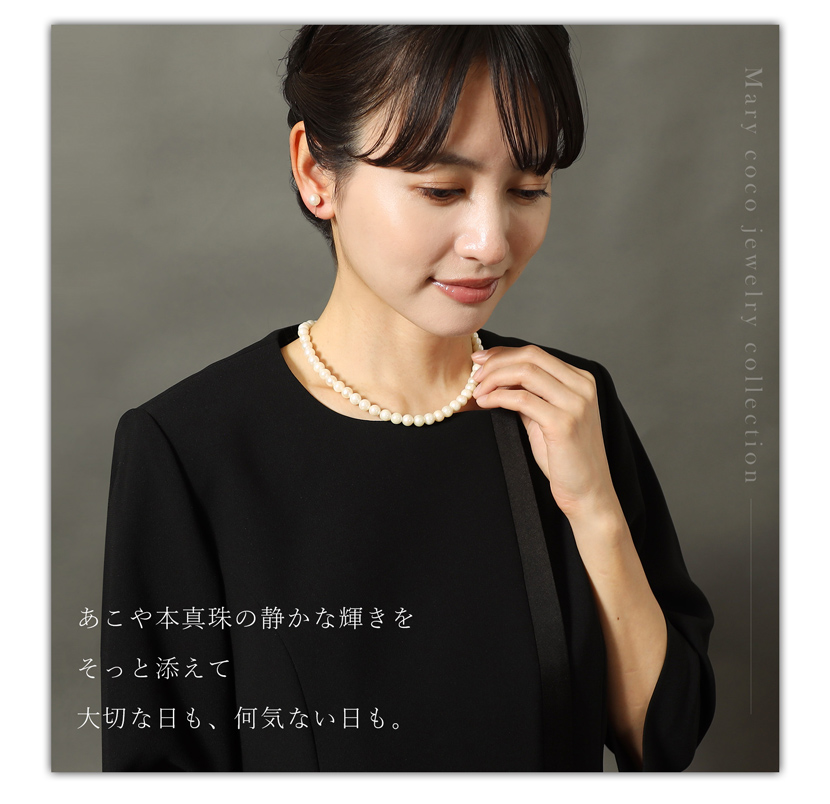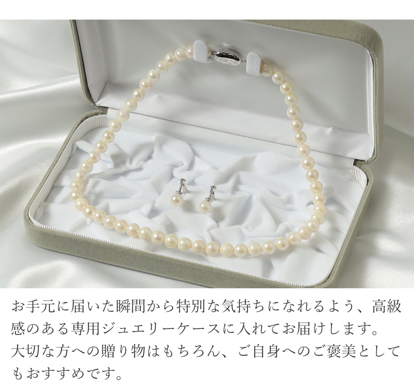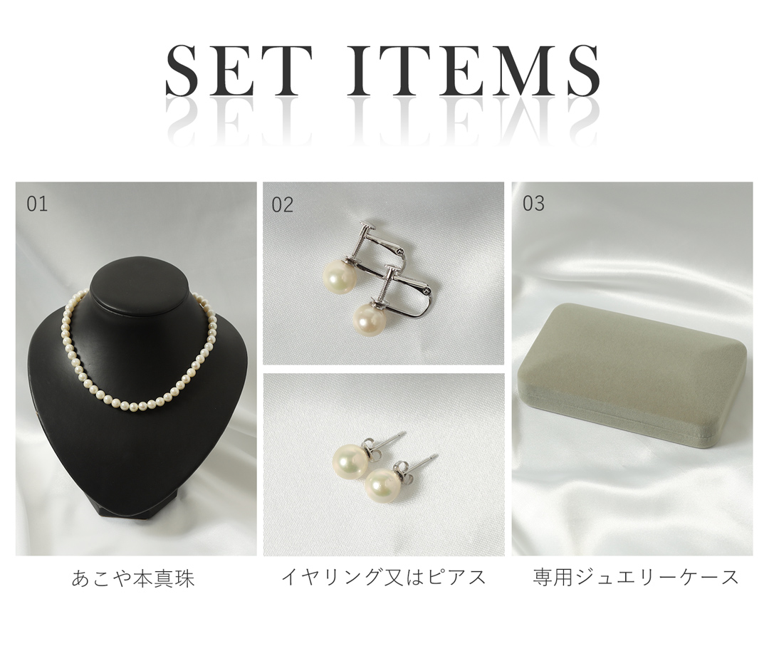 美しい輝きをまとったあこや本真珠。ネックレスとピアスorイヤリングの2点セットで冠婚葬祭など様々な場所でご使用できます。