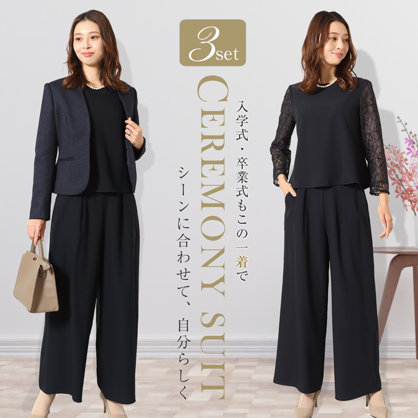 セレモニースーツ ワイドパンツ レディース 3点セット セット スーツ オールシーズン 結婚式 七五三 入園 入学 卒園 卒業 ママ 母 服 ネイビー lex-2301