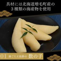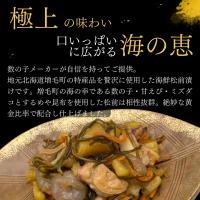 【原材料名】鰊の卵(北海道産)、ミズダコ、甘えび、昆布、人参、砂糖、醤油、するめ、アミノ酸液、食塩、鰹節エキス、発酵調味料、昆布エキス、梅酢、醸造酢/調味料(アミノ酸等)、ソルビトール、酒精、酸味料、増粘多糖類、カラメル色素、リン酸塩(Na)、保存料(ソルビン酸K)、pH調整剤、(一部に小麦・大豆・さばを含む)