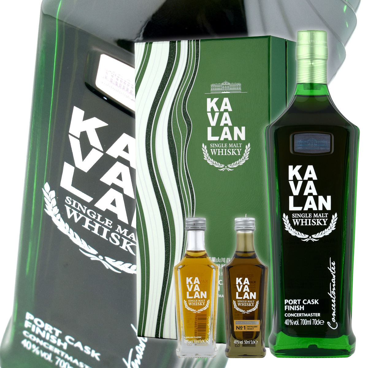 ・コンサートマスターポートカスクフィニッシュ 700ml・クラシック 50ml・ディスティラリーセレクトNo.1 50ml上記3点セットです。【コンサートマスターポートカスクフィニッシュ】ポルトガルのルビーポートワイン樽でフィニッシュするカバラン・コンサートマスター・ポートカスクフィニッシュは、厳選されたアメリカンオーク樽で熟成された後にポートバリックでフィニッシュされる。バリックでの熟成は風味をまろやかにし、ウイスキーに何とも言えない滑らかさを加える。リッチボディで自然な甘みと複雑味がある。【クラシック】カバラン・クラシック・シングルモルトウイスキーは、台湾から生まれるウイスキーの品質の高さを体現しています。蒸留所の職人技が、湿度の高い台湾の気候と相まって、多様で複雑なウイスキーを生み出している。フレッシュでクリーンなウイスキーで、シルクのような滑らかさとトロピカルフルーツ、特にマンゴーの香りが豊かです。【ディスティラリーセレクト?1】カバランのディスティラリーセレクトシリーズは、最高峰のブレンド技術と絶妙なカスクセレクションをで作られている。ディスティラリーセレクトNo.1は、カバラン特有のトロピカルフルーツのアロマを絶妙に引き出し、ソフトで厚みのある多層的な味わいを生み出す。その香りは長く続き、クリーミーなトフィー、ウッディネス、バニラの香りが長い余韻を残す。「KAVALAN」は2006年に蒸溜所を創設し、2008年からウイスキーを発売。蒸溜所は台湾の北東部の宜蘭県(キ?ーラン)という山岳地の水が豊富な場所に位置する。ウイスキーはスコットランドなどの冷涼な地域で造られるのが一般的で、暖かい地域では良質のウイスキーは造れないと言われていた。しかしカバランが蒸留所を構えるのは、亜熱帯の地域で、ウイスキーづくりに向かない場所と言われながらも、金車集団の30年に及ぶ飲料事業で培った知見を活かし、高品質のウイスキーの生産に成功。現在では世界各国のコンペで最高賞を受賞するなど評価を得ています。