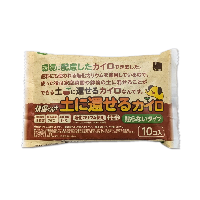 肥料にも使われる塩化カリウムを使用しているので、使った後は家庭菜園や鉢物の土に混ぜることができる、土に還せるカイロです。
