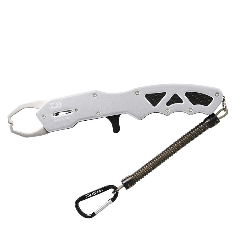 ダイワ ■対象魚にあわせた3サイズ展開 ■トリガー部を引くだけで爪部を開き、魚をホールドする ■ステンレス製フック部で小型から中型の魚まで対応 ●カラー:シルバー ●全長:230mm ●自重:185g|両開き構造で魚をホールドしやすい「フィッシュグリップV」。[FISH GRIP V] MST-12-08-01