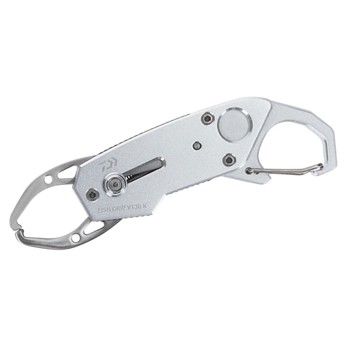 ダイワ ■持ちやすいデザイン手になじみやすく、持ちやすい外形デザイン。 ■落とし防止尻手ロープ、カラビナ付きで使用しない時にゲームベストなどに引掛け、落とし防止可能。 【注意事項】※V130は尻手ロープなし、カラビナは本体と一体化デザインしてます。 ※ひっかける場所によってカラビナは取り付けできない場合があります。 ●カラー:シルバー ●全長:130cm ●自重:80g|両開き構造で魚をホールドしやすい「フィッシュグリップV」。トリガー部を引くだけで爪部を開き、魚をホールドする。持ちやすいデザイン形状。ステンレス製フック部で小型から中型の魚まで対応。[FISH GRIP V] MST-12-08-01