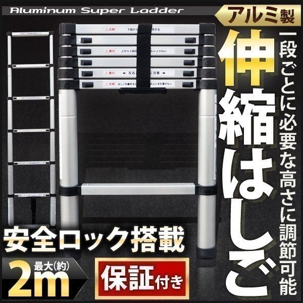 伸縮はしご はしご ハシゴ 伸縮 梯子 アルミ 製 便利 保証付き 安全ロック 搭載 2.0m 2m 滑り止め付 軽量 スーパーラダー スライド式 高所作業 雪下ろし