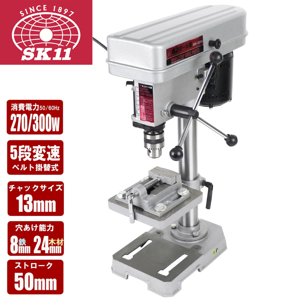 卓上ボール盤 穴あけ 金属 木材 穴あけ作業 SDP-300V 速度調整 5段階 穴あけ深さ 調整機能 付き 金属穴あけ 8mm 木材穴あけ 24mm SK11