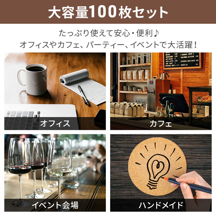 100枚セットのため、頻繁にコースターを使うオフィスやカフェ、大人数が集まるパーティーやイベントなどで重宝します。
