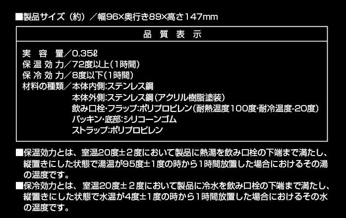 仕様/その他:保温効力(約)/72度以上(1時間)、保冷効力(約)/8度以下(1時間)