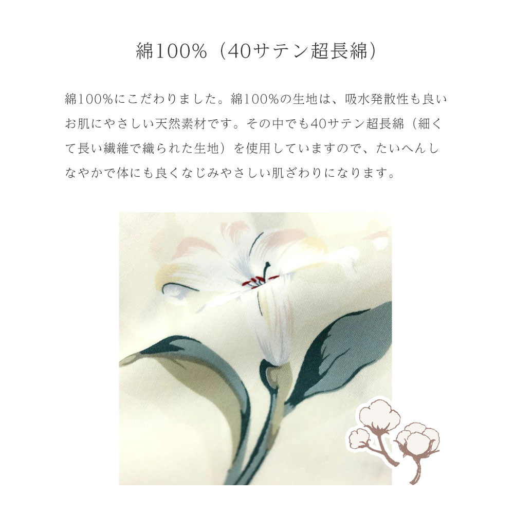 綿100%(40サテン超長綿)綿100%にこだわりました。綿100%の生地は、吸水発散性も良いお肌にやさしい天然素材です。その中でも40サテン超長綿(細くて長い繊維で織られた生地)を使用していますので、たいへんしなやかで体にも良くなじみやさしい肌ざわりになります。