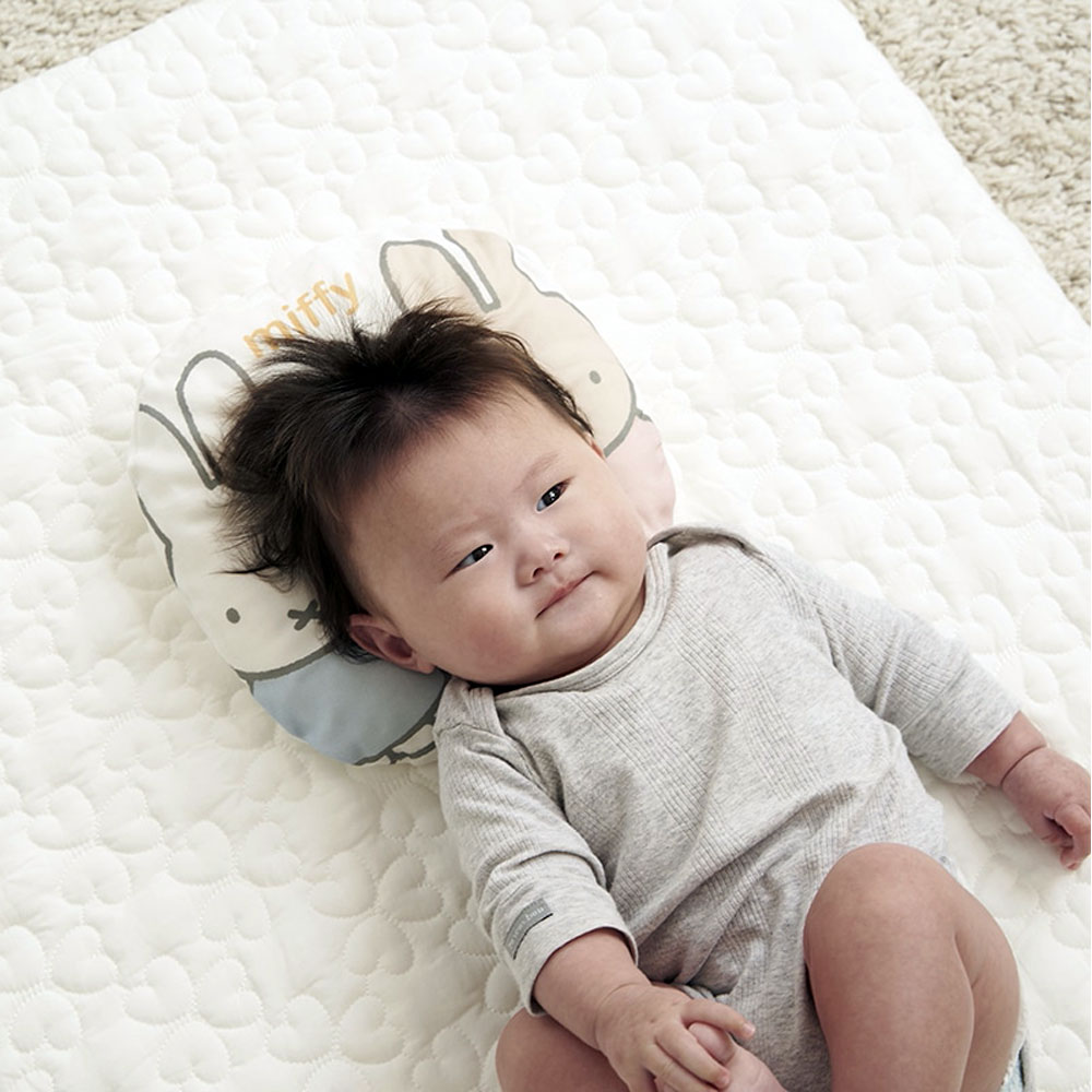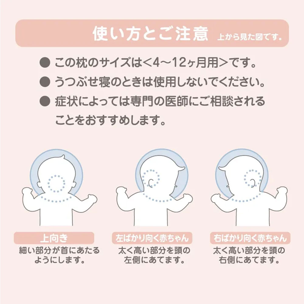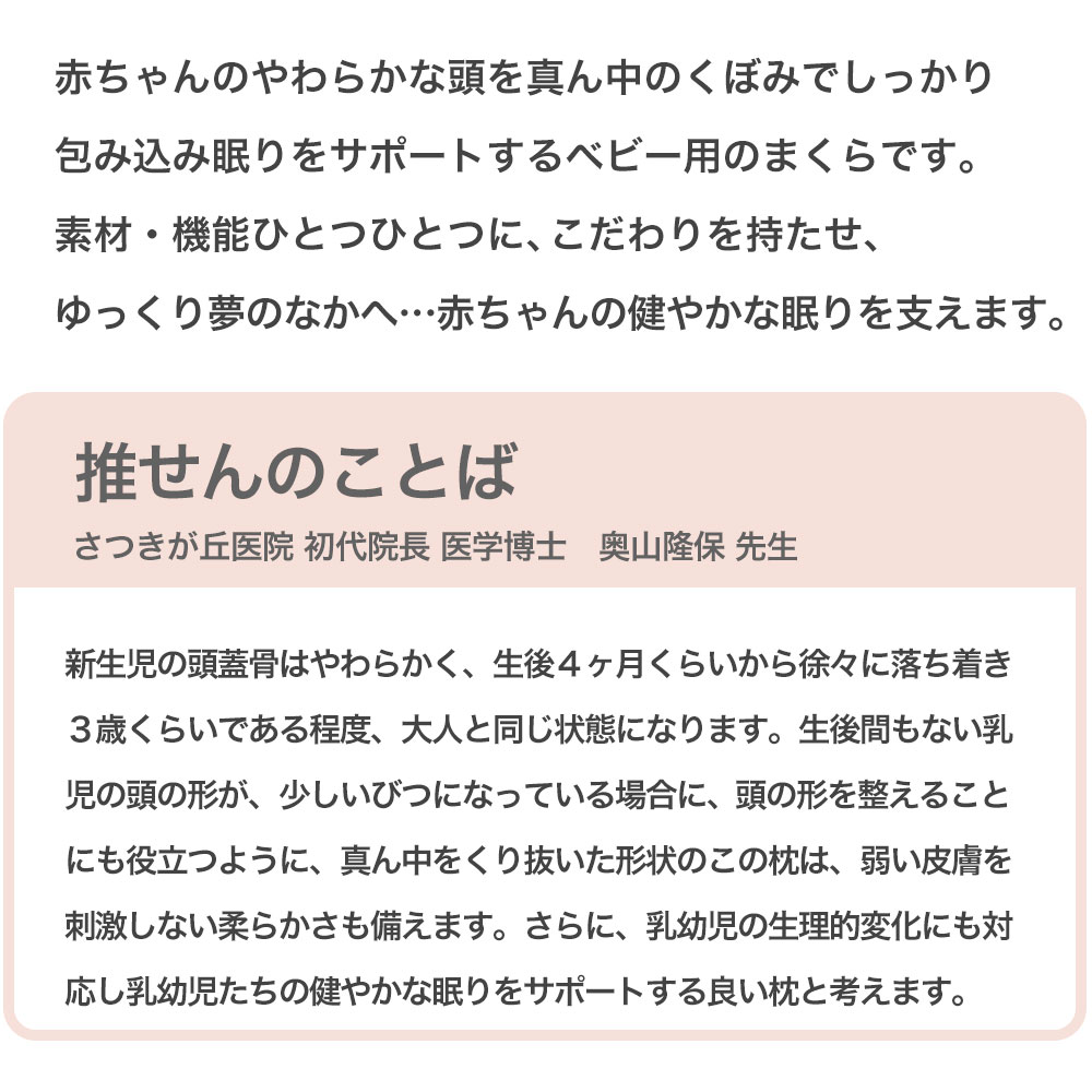 赤ちゃんのやわらかな頭を真ん中のくぼみでしっかり包み込み眠りをサポートするベビー用のまくらです。
