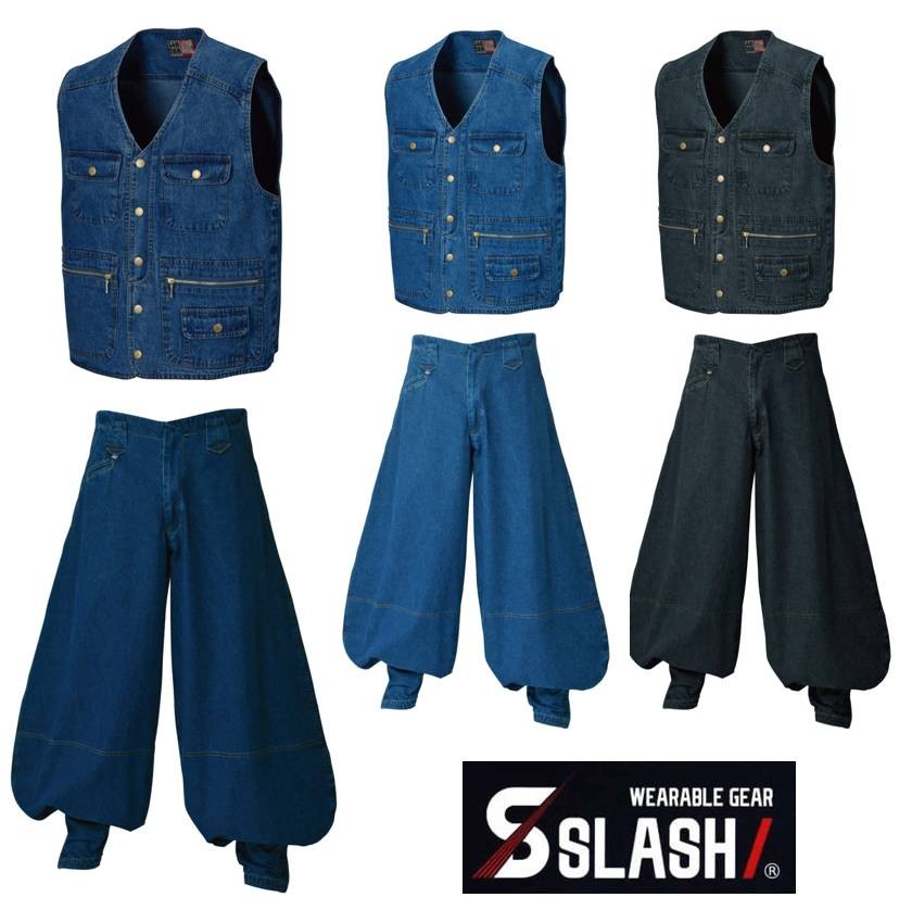 SLASH デニム ベスト 超々ロング 上下セット 鳶 M〜3L かんたん刺繍申込み 綿100% シンメン 820 822 八分 七分 超超ロング 上下組 三段鳶