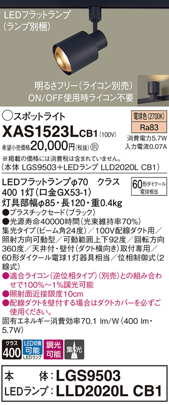 パナソニック(Panasonic) 配線ダクト取付型 LED(電球色) スポットライト ビーム角24度・集光タイプ 調光タイプ(ライコン別売) XAS1523LCB1