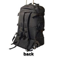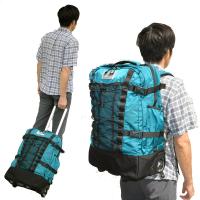 背負いベルトはファスナーポケットに収納可能で、簡単に出し入れできます。正面のゴムバンド付きメッシュポケットや両サイドのポケット付きで中に収まりきらない荷物や汚れた道具などを収納できます。正面のループテープにカラビナなどを付けられます。傷みやすい底部は1000デニールナイロン。車輪カバー付き。