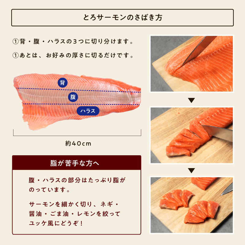 トロサーモンを、骨取り済み&皮引き済み&あとは切るだけ状態の半身フィレにした商品です♪