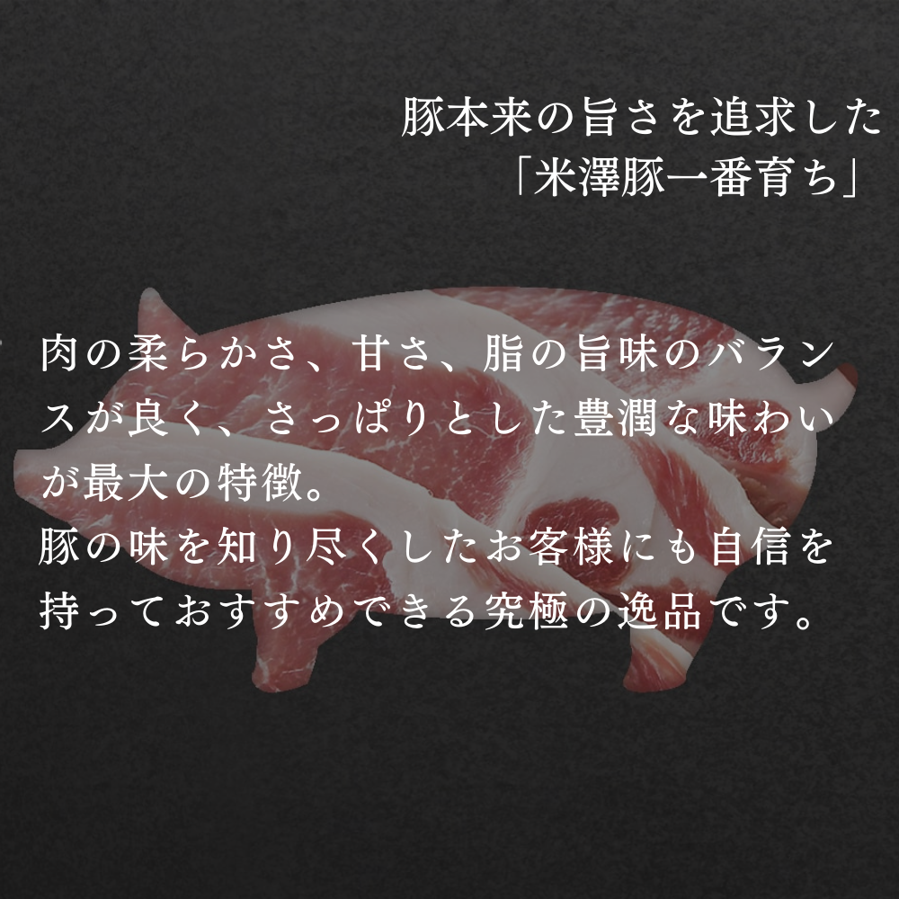 「米澤豚一番育ち」は美味しさにこだわり、ランドレース種と大ヨークシャー種を交配させた豚のSPF豚に、霜降りが特徴のデュロック種を交配させた「三元交配豚」です。肉の柔らかさ、甘さ、脂の旨味のバランスが良く、さっぱりとした上品な味わいが最大の特徴です。豚本来の旨さを追求した「米澤豚一番育ち」の美味しさは、豚の味を知り尽くしたお客様にも自信を持っておすすめできる究極の逸品です。