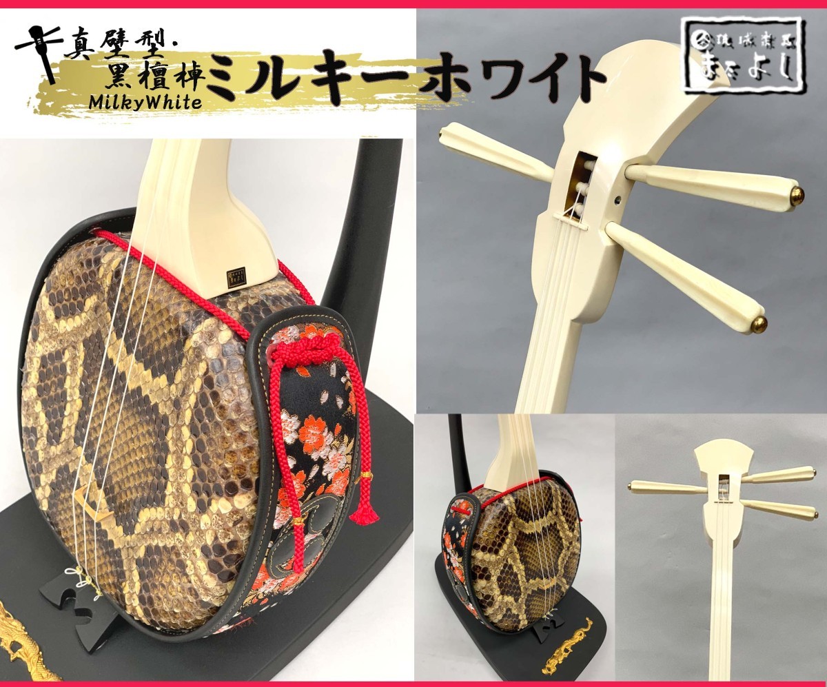 ミルキーホワイト棹 沖縄三線 真壁型 黒檀棹(強化張り)