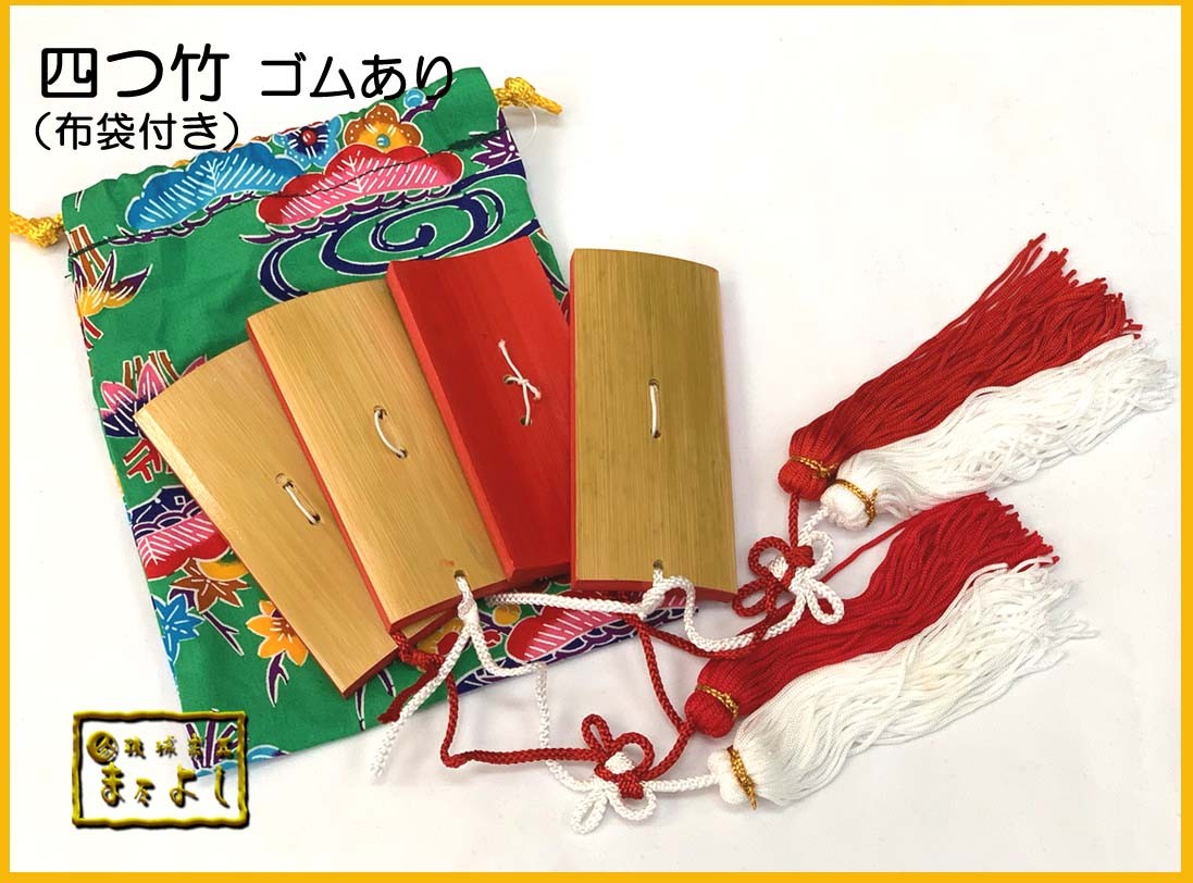 四つ竹の中央のゴムに指を通しカチカチと音を鳴らして使用します。