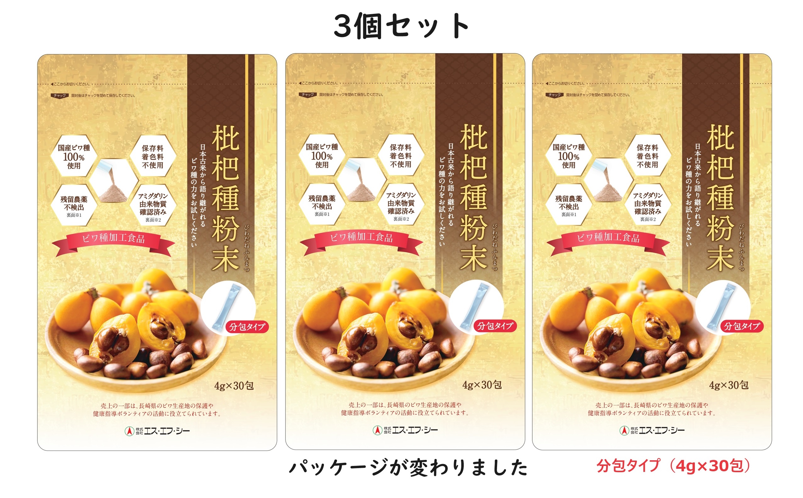 新パッケージ 枇杷種粉末 分包タイプ 120g(4g×30包)3個セット 国産ビワ種100%使用 アルミパック