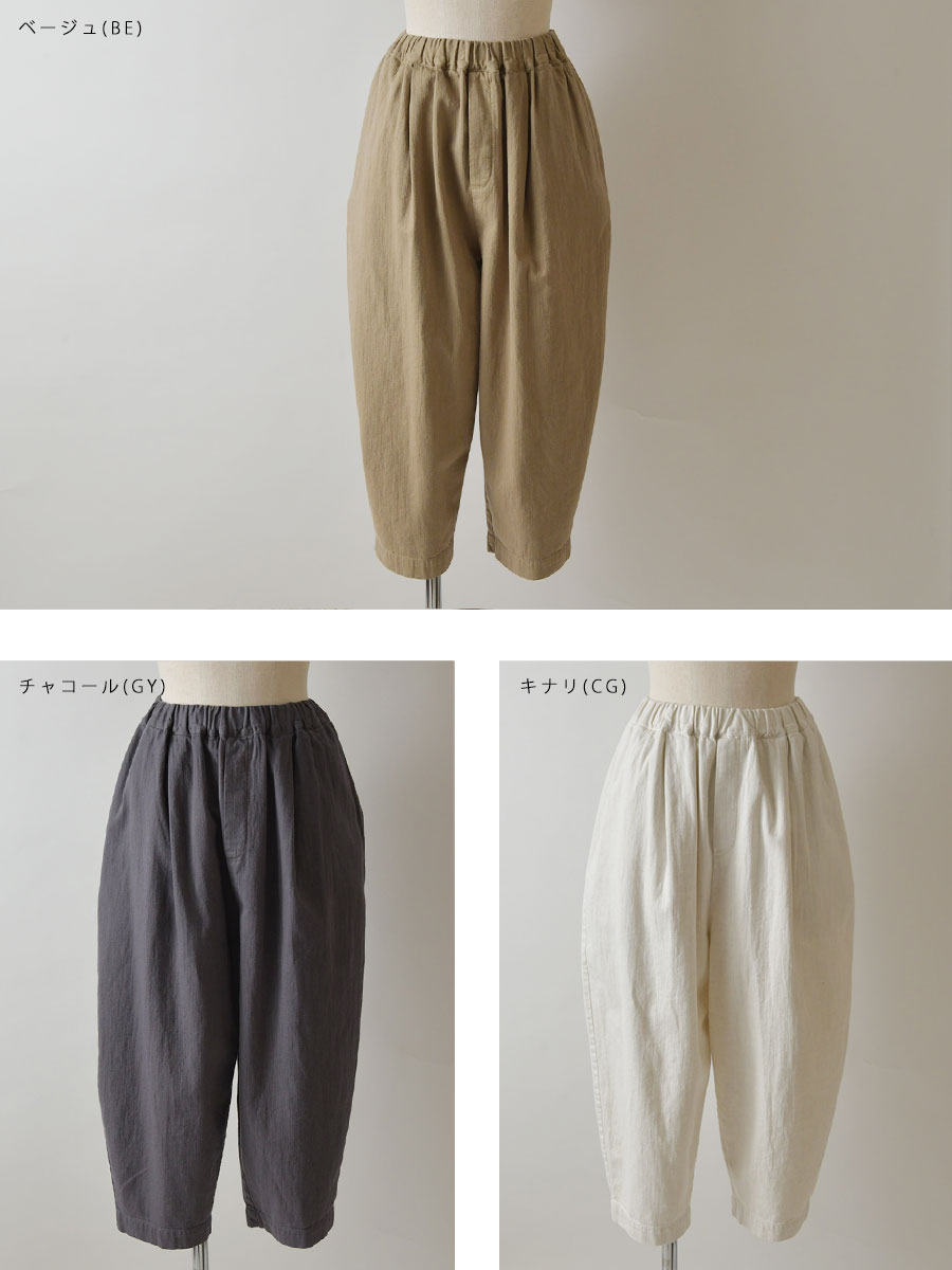 【bul bul バルバル】より コットン リネン ツイル 製品染め カーブ コクーン パンツのご紹介です。 足首が出るくらいの丈感で、太過ぎず丸みがあって可愛いデザイン。 薄手でハリのあるコットンリネンのツイル生地を製品染めしています。 リネンのナチュラルな色合いを活かして染め上げていますので、 少しグレイッシュな優しい色味に仕上がっています。 ドライな質感で肌ばなれが良く、製品染めすることにより程良い色落ち感が出ています。 キレイめにも、カジュアルにも使える一枚です。 | |||||||||