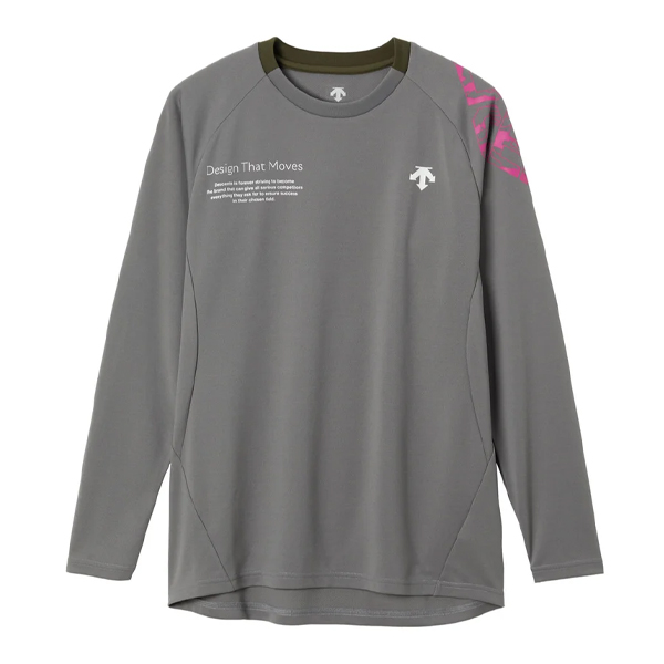 肩口のグラフィックプリントと袖口の配色がデザインアクセントになっています。