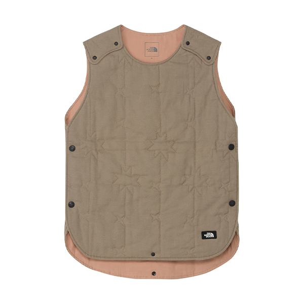 表地と裏地にはやわらかなオーガニックコットンを採用。中わたには、サステナブルを考慮したカポック混素材を採用。両肩と脇は着脱がしやすいドットボタン仕様です。