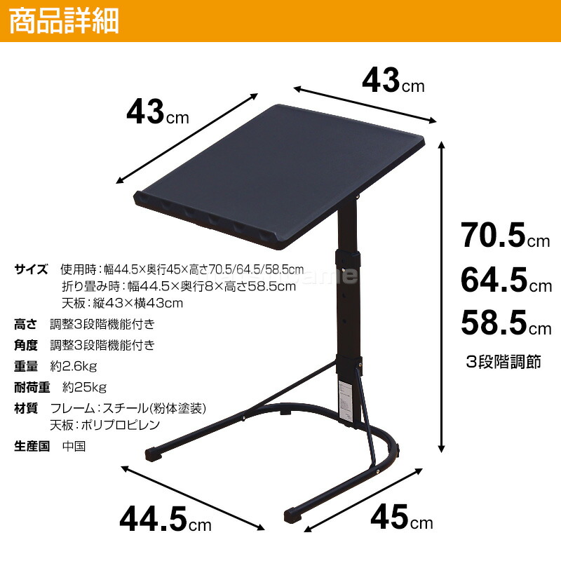 | 折りたたむと厚さ8cmまで薄くなり、ちょっとした隙間に簡単に収納していただけます。 天板の高さは58.5、64.5、70.5cmの3段階で調節可能です。 天板の角度は3段階調節可能で、使用状況に応じて変えていただけます。 天板の耐荷重は25kgあり、食事やノートパソコンなどを置いても安心です。 カラー:ブラック・ホワイト・木目 サイズ(約):幅44.5×奥行45×高さ70.5/64.5/58.5cm 折り畳み時サイズ(約):幅44.5×奥行8×高さ58.5cm 重量(約):2.6kg 耐荷重:25kg 材質:スチール(粉体塗装)、ポリプロピレン |