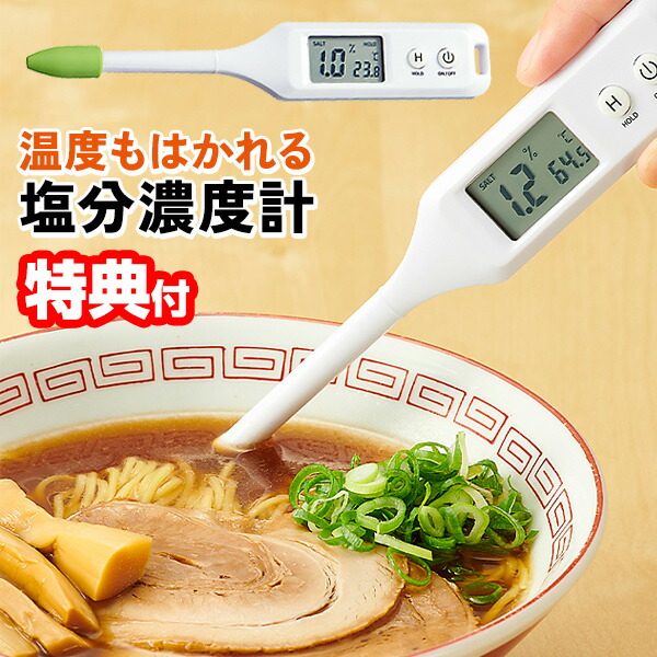 | 塩分の取りすぎ予防に「はかって食べる」習慣作り! 味噌汁・お吸い物・スープなどの汁物の塩分濃度が簡単にはかれます。 温度管理もできておいしさアップ! ※おいしい温度…味噌汁62〜70℃、お吸い物・スープ60℃ 商品サイズ:外形寸法30×15×180mm 質量:(約)34g(キャップ・モニター用電池含む) 主な材質:本体/ABS樹脂、先端/ステンレス鋼・黄銅(金めっき) 測定方法:電気伝導度測定方式 表示方法:デジタル表示 測定範囲:塩分濃度0.0〜1.9% 測定精度:±0.2% 測定温度:0〜70℃(測定物の温度) 電池寿命:1日5分間の使用で(約)6ヵ月 電源:ボタン電池(CR2032×1個) 耐熱温度:80℃ 付属品:キャップ、取扱説明書(保証書付き)、モニター用電池(CR2032×1個) 原産国:中国 JANコード:4989409099760 【測定上の注意】 ●測定物はさらさらした液体(例:味噌汁、スープ、煮汁など)になります。粘性の高い液体や固形物の測定はできません。 ●測定物の温度は0〜70℃です。 ●油分が多く含まれる測定物は正確な測定ができません。 ●測定時にはセンサー部が全て隠れるように測定物に浸けてください。 ●測定は測定物をよくかき混ぜた後、センサー部を10秒以上浸けた状態で行ってください。 ●測定中、センサー部が測定物の容器に触れないよう注意してください。 ●測定物の具材にセンサー部が触れないよう注意してください。 ●加熱中の鍋などに入れないでください。 ●沸騰したスープなどの測定物の中には入れないでください。 【取扱い上の注意】 ●丸洗いやつけ洗いなどをしないでください。 ●食器洗い機、食器乾燥機などの使用は絶対にしないでください。 ●食品以外の液体の塩分測定には絶対に使用しないでください。 ●高温や直射日光の当たるところ、温度・湿度の変化の激しいところ、ほこりの多いところに保管しないでください。 ●お手入れの際、シンナーやベンジンなどは使用しないでください。 |