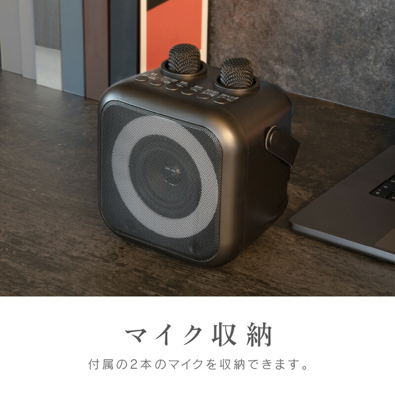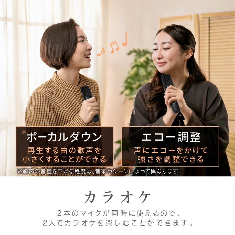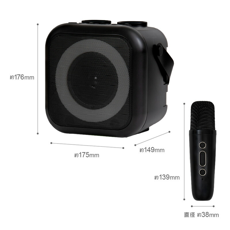 | ○ボーカルダウン機能で、いつも聞いている音楽でカラオケが楽しめる ○マイクも2本付きでデュエットも可能(マイクは本体に収納できる) ○充電式なので手軽に持ち運び可能 ○カラオケだけでなく、セミナーやイベントなどで無線マイクスピーカーとしても幅広く活躍 【仕様】 [本体] ○Bluetooth Ver.5.3 伝送距離:最大(約)30m<本体-マイク> ○リチウムイオン電池 3.7V 2,200mAh ○充電端子:USB-Type-C ○連続再生時間:2.5時間 ※音量最大の場合 ○対応メディア:USBメモリ(MP3)、AUX(Φ3.5ステレオミニジャック) ○実用最大出力:5W [マイク] ○リチウムイオン電池 3.7V 400mAh ○充電端子:Type-C ○連続使用時間:約20時間 本製品の電池は「取り外し不可の充電式電池」であり、電気用品安全法におけるPSE対象電池(取り外し可能な電池パック等)には該当しません。 そのためPSEマークの表示は不要な仕様となっております。 |